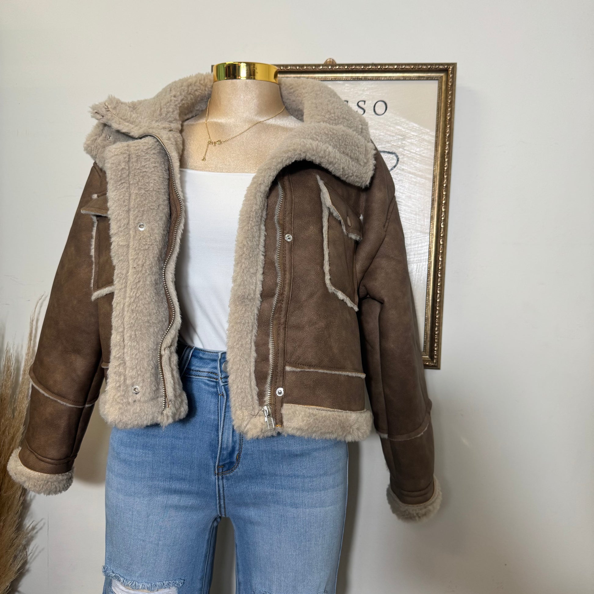 Long Sleeve Pocket Detail Faux Leather Inner Fur Jacket-Brown