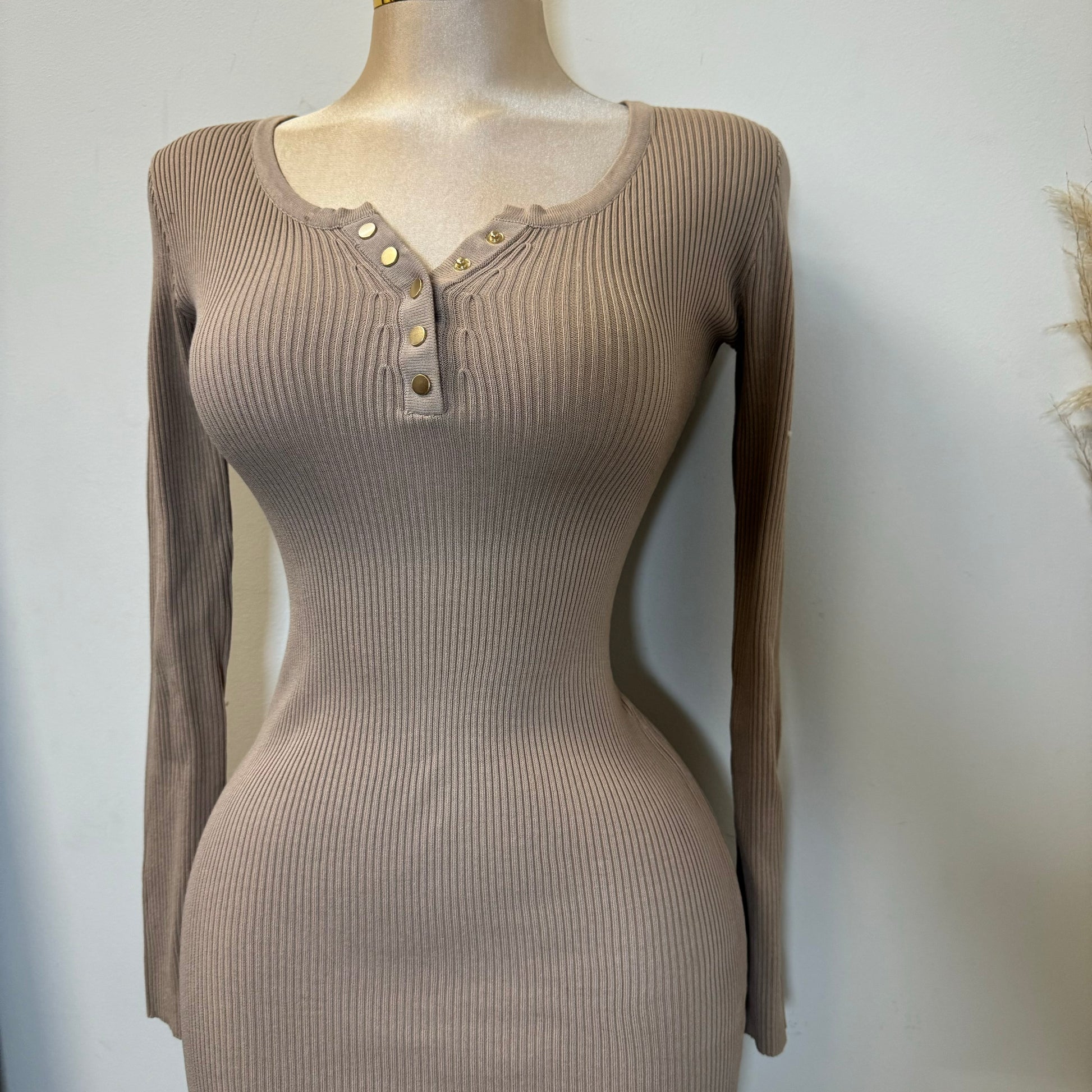 -Long Sleeve Henley Neck with Snap Button Sweater Midi Dress