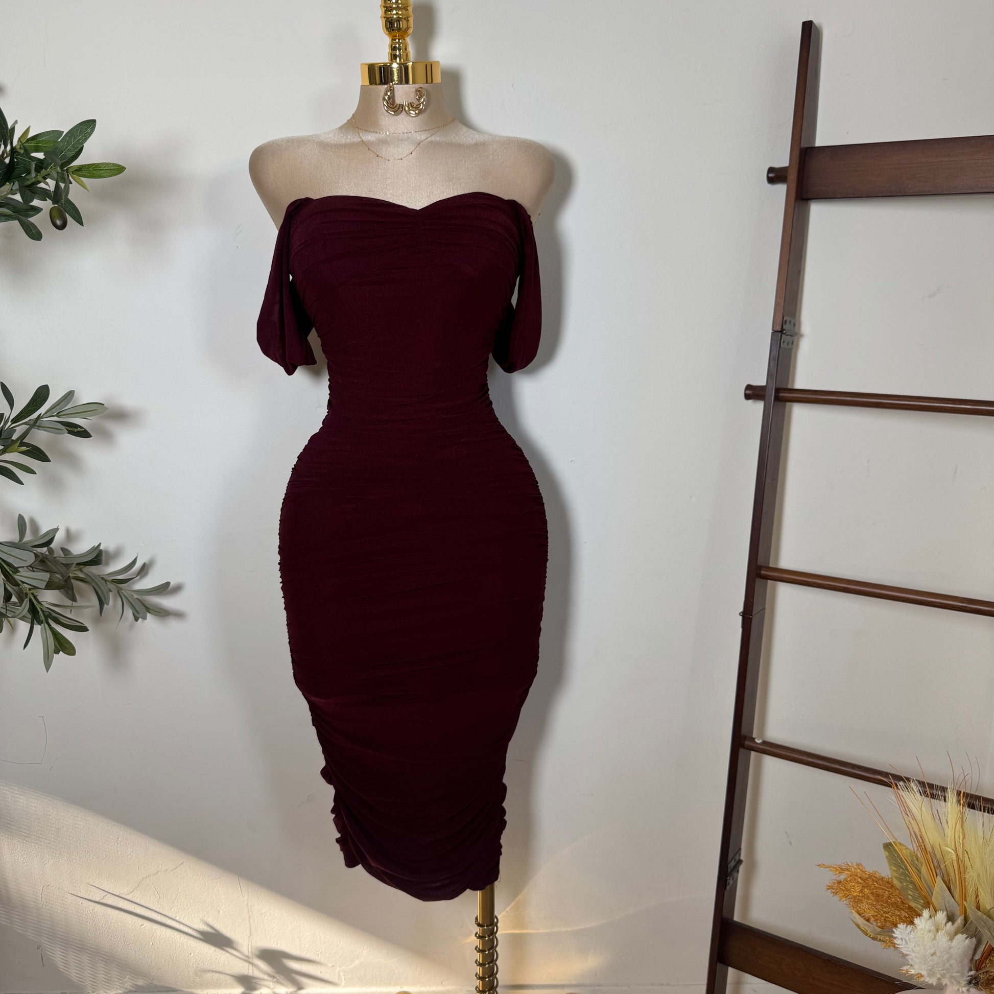LUXE GLITTER MESH OFF SHOULDER RUCHED MIDI DRESS-Cherry