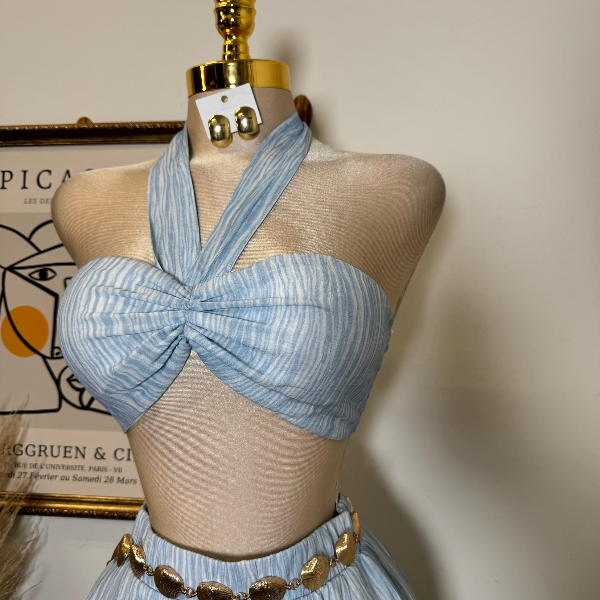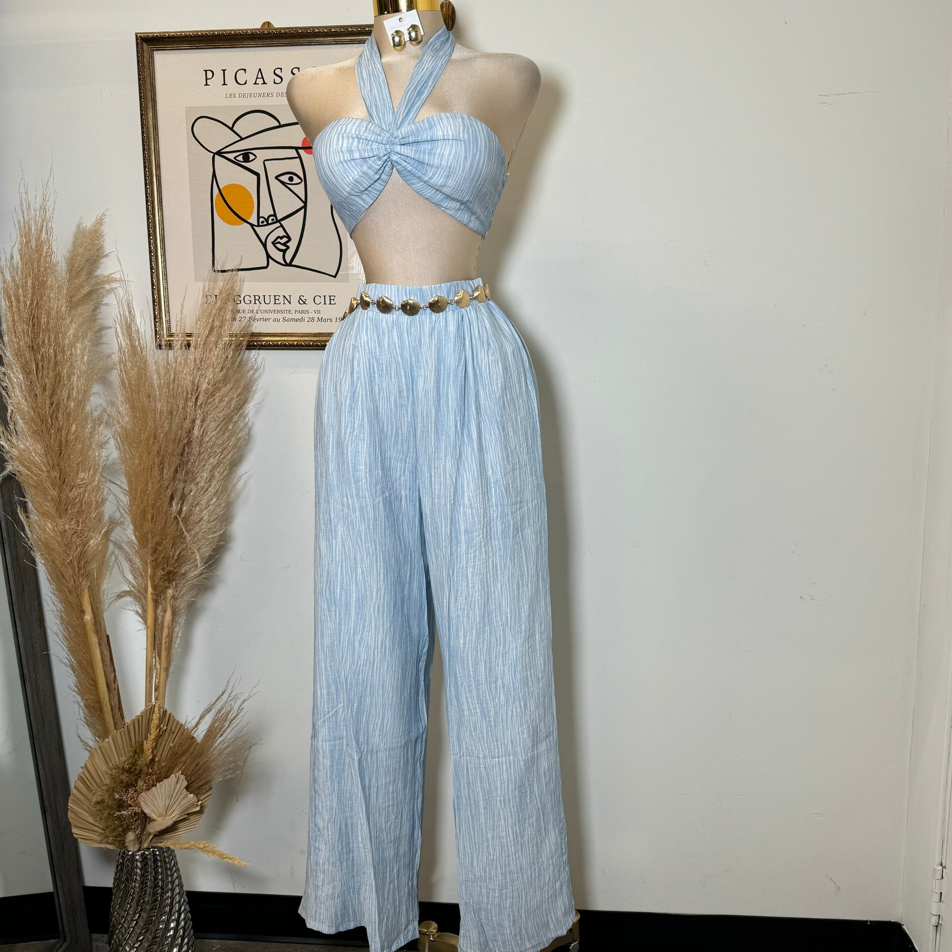 CRINKLE WOVEN PRINT FRONT TIE CROP CAMI & WIDE PANTS SET