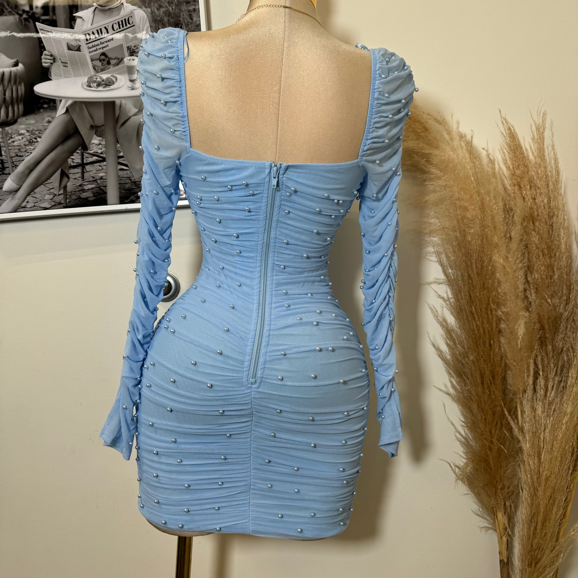 LUXE PEARL MESH SWEETHEART LONG SLEEVES RUCHED MINI DRESS