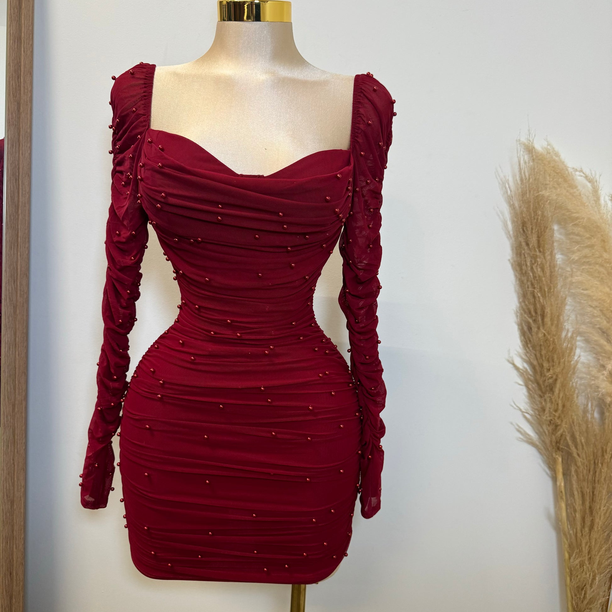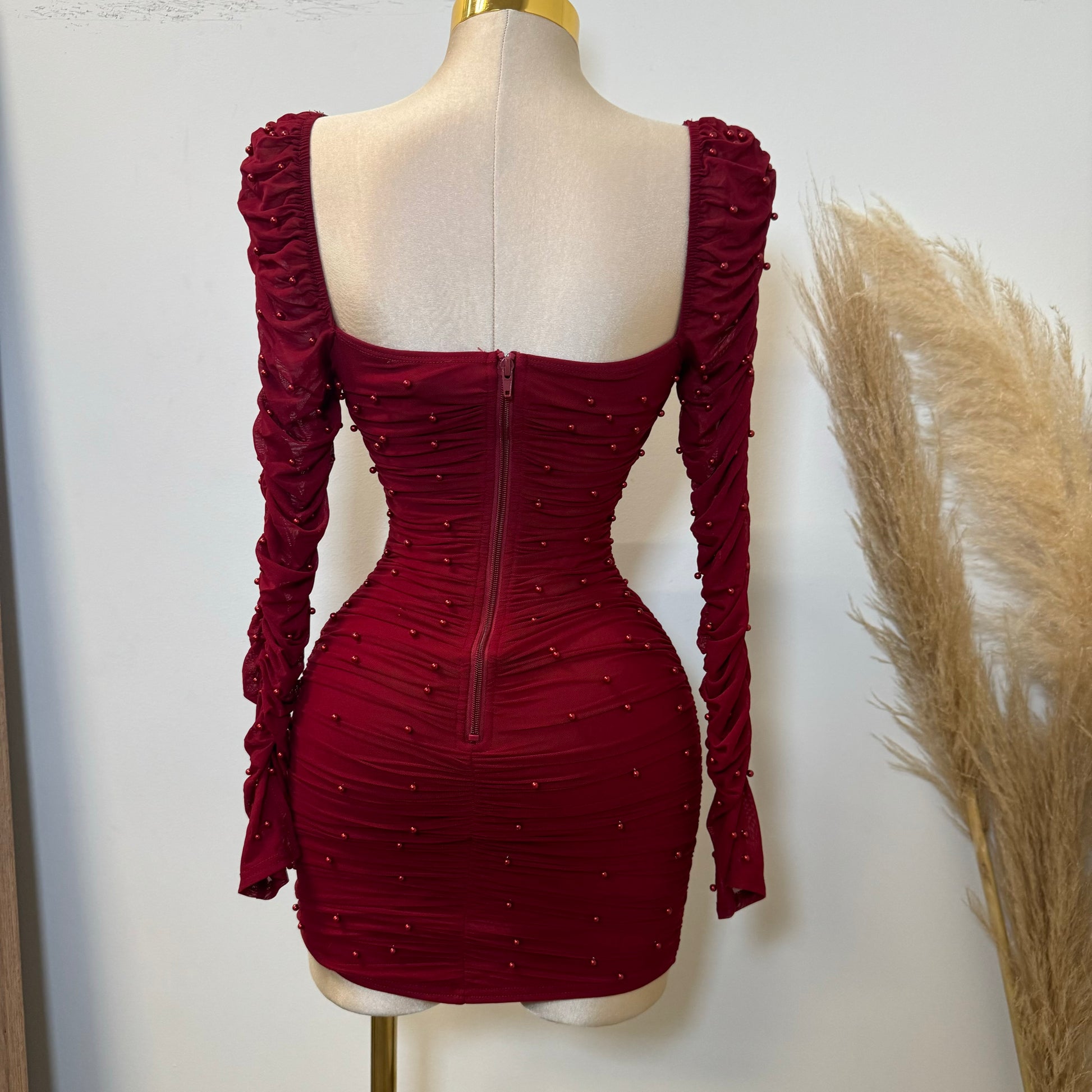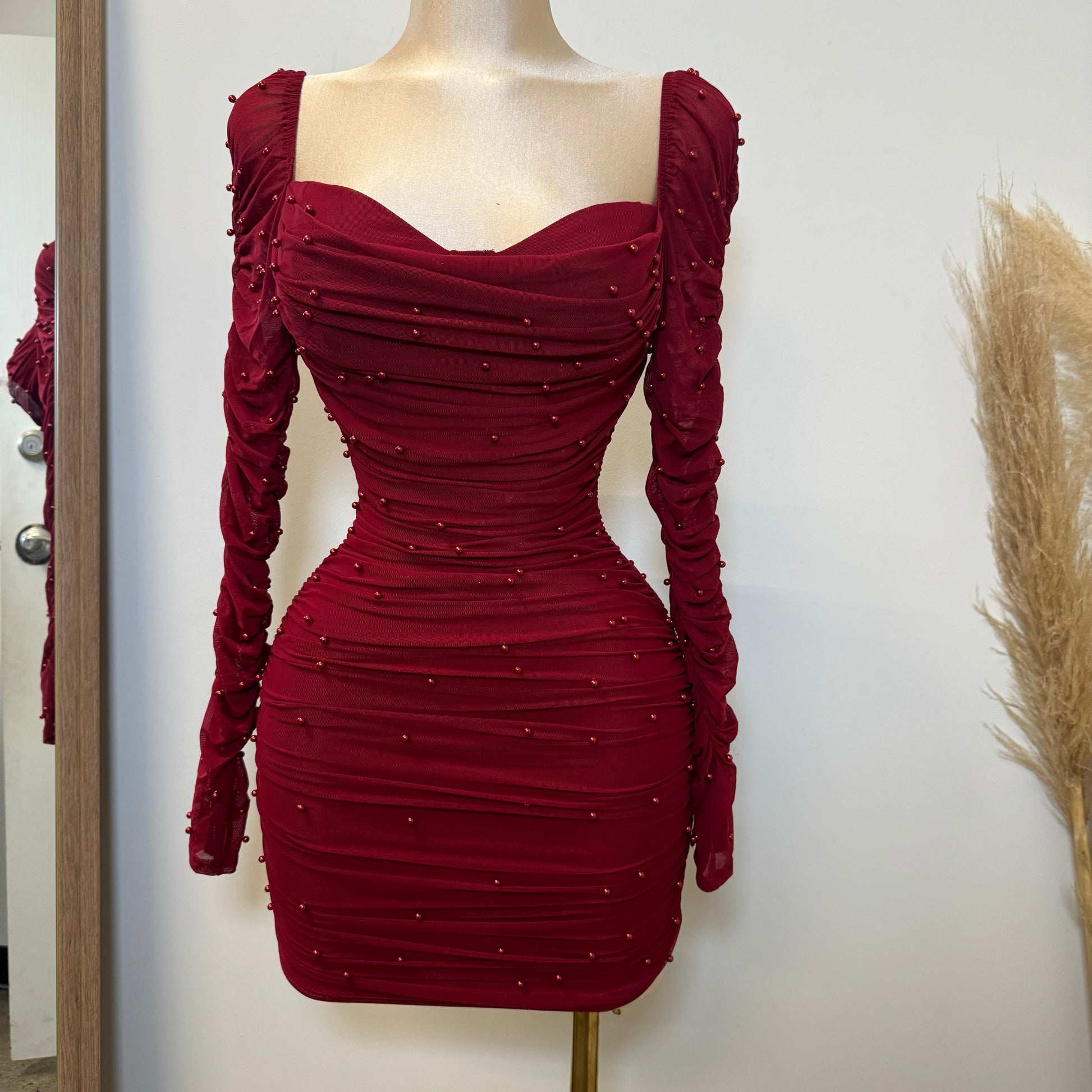 LUXE PEARL MESH SWEETHEART LONG SLEEVES RUCHED MINI DRESS