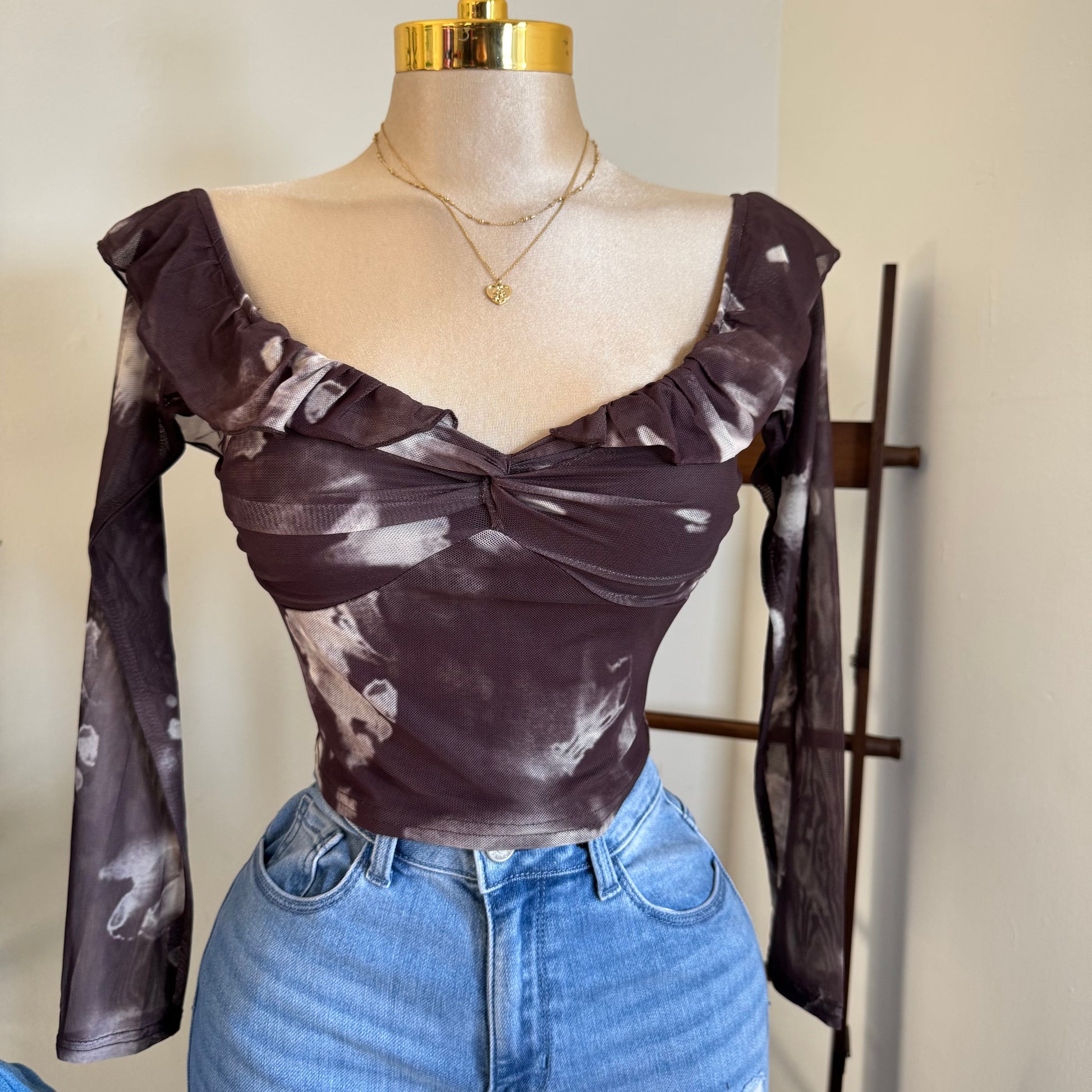 MESH PRINT RUFFLE OFF SHOULDER TWIST FRONT DETAIL LONG SLEEVE TOP