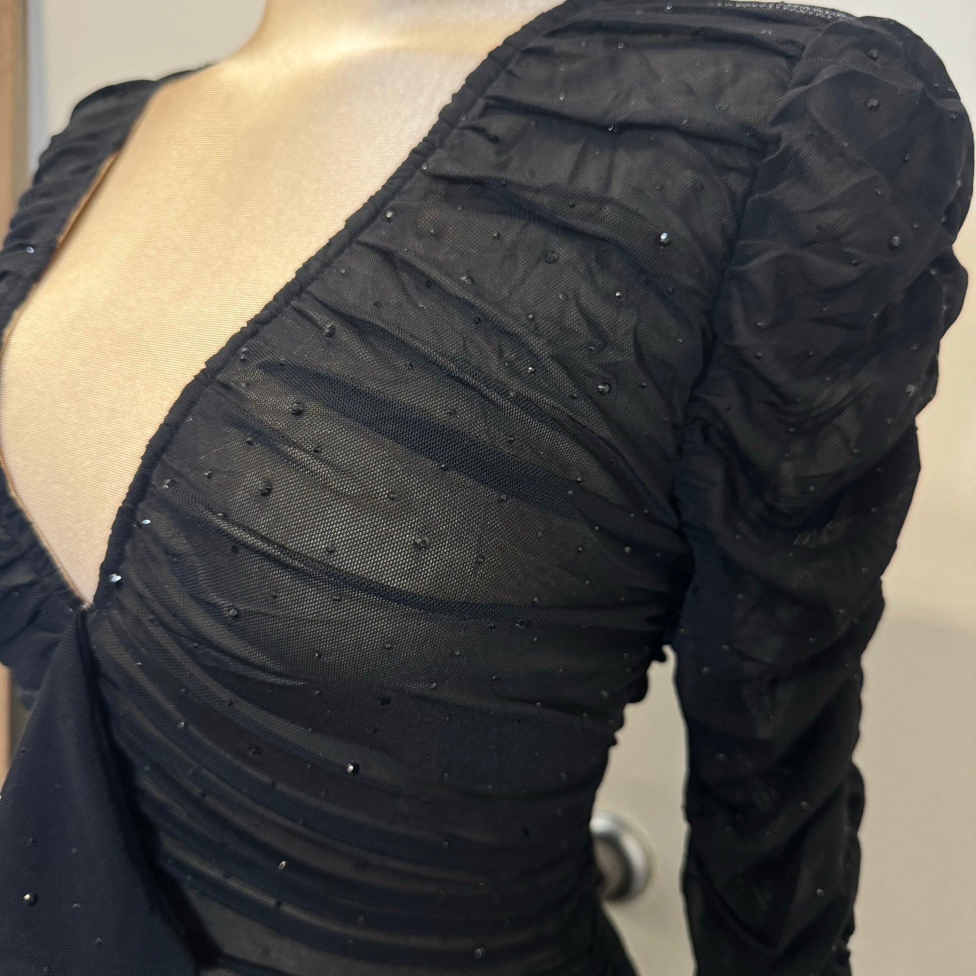 LUXE HOTFIX STONES EMBELLISHED MESH DEEP V-NECK RUFFLED DRAPED FRONT DETAIL LONG SLEEVES RUCHED MINI DRESS
