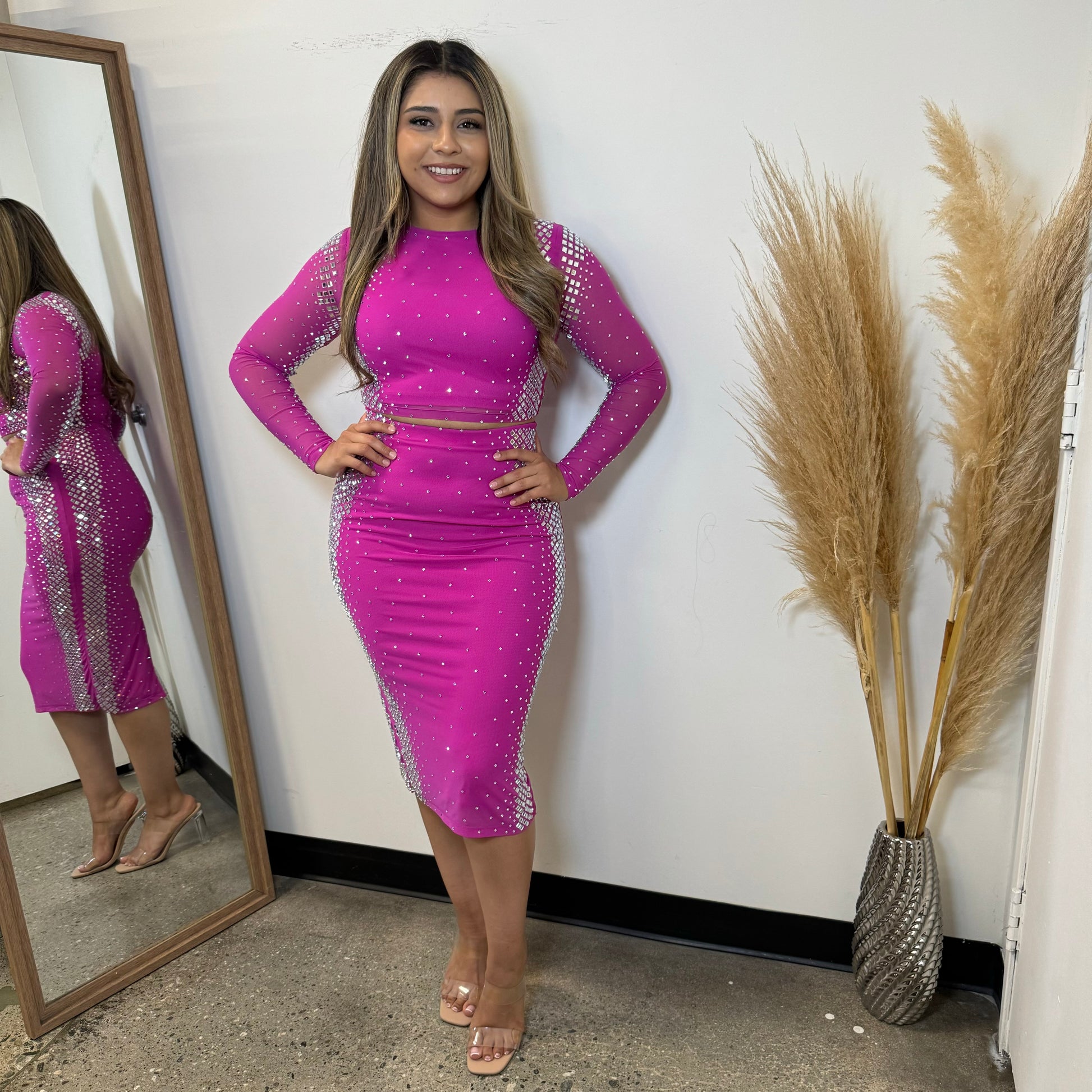-Square Rhinestone set Top And Skirt Bottom Mesh Long sleeve Crop Top