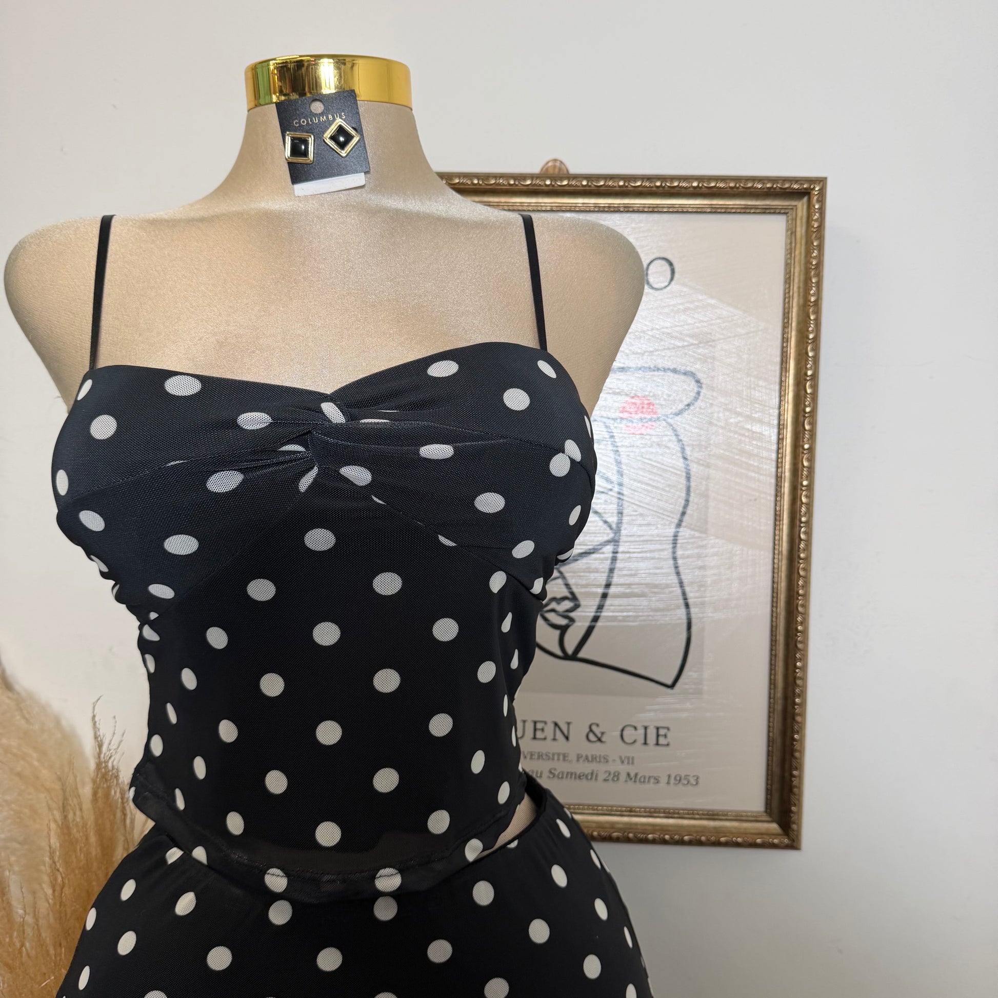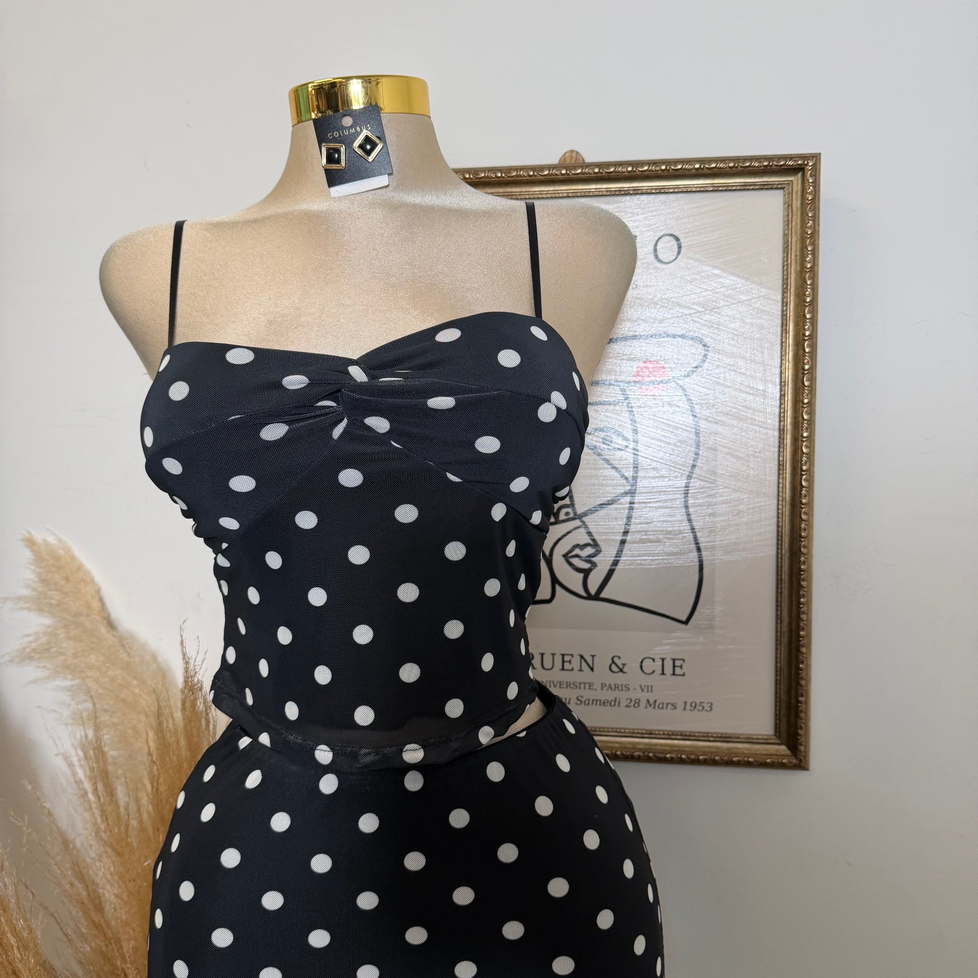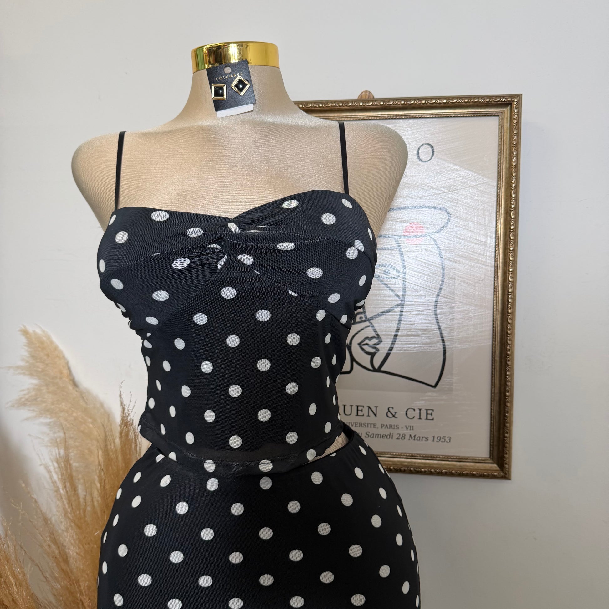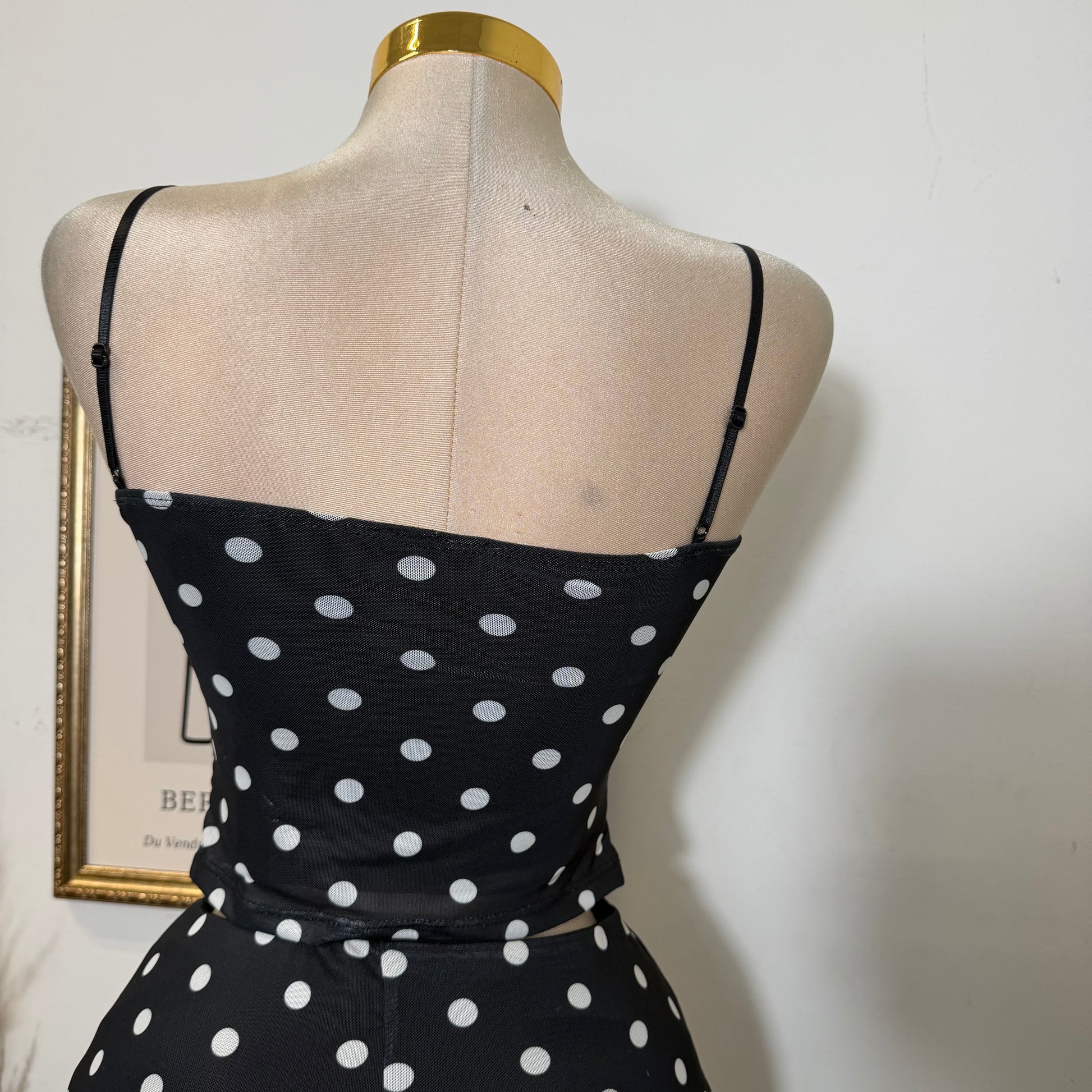 Polka DoT Mesh Print Twist Cami Top & Slit Maxi Skirt-White/Black