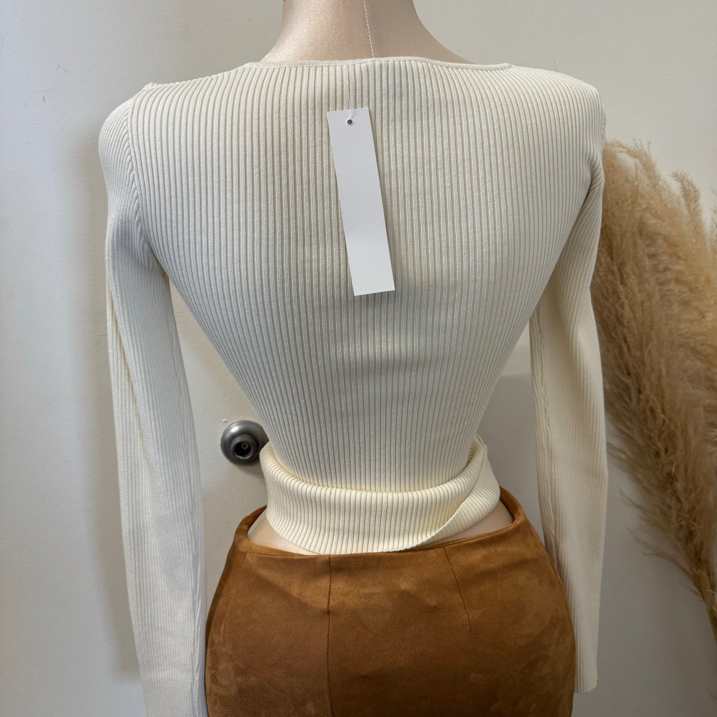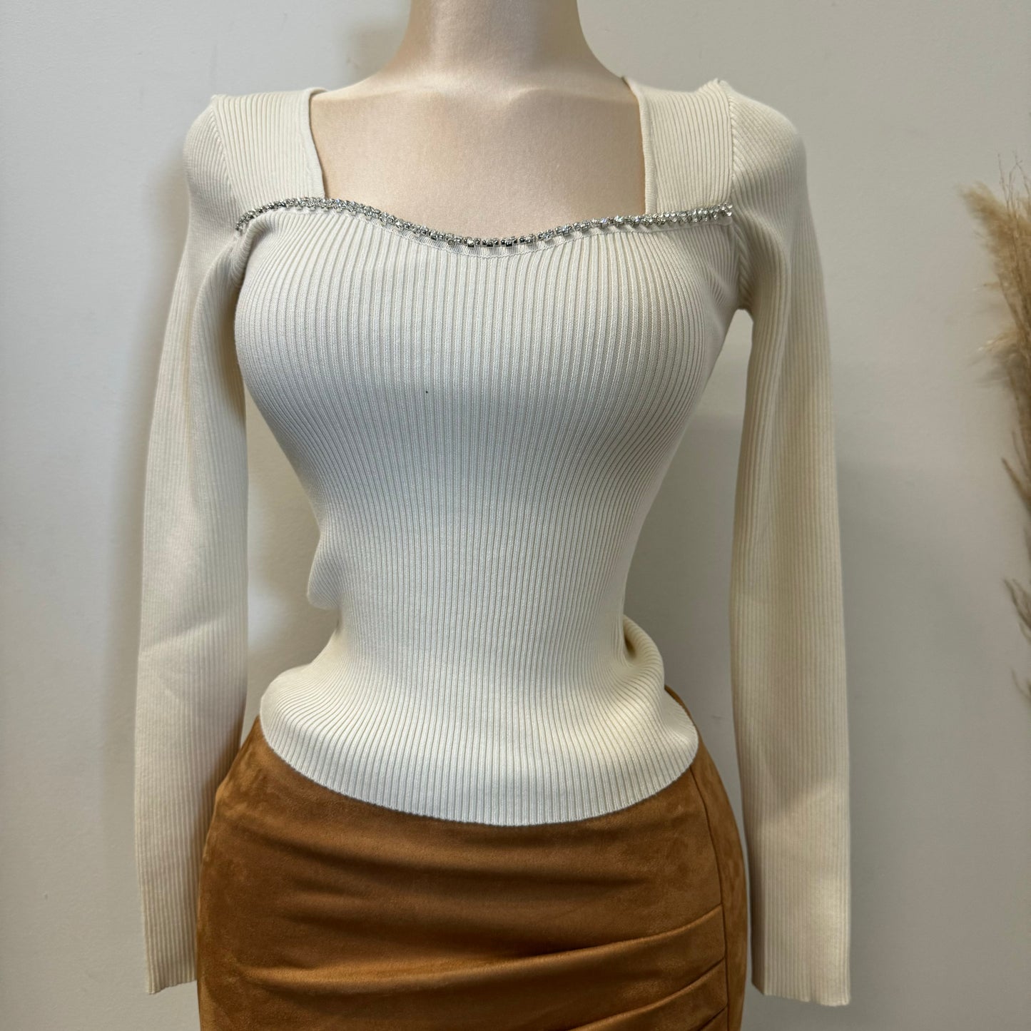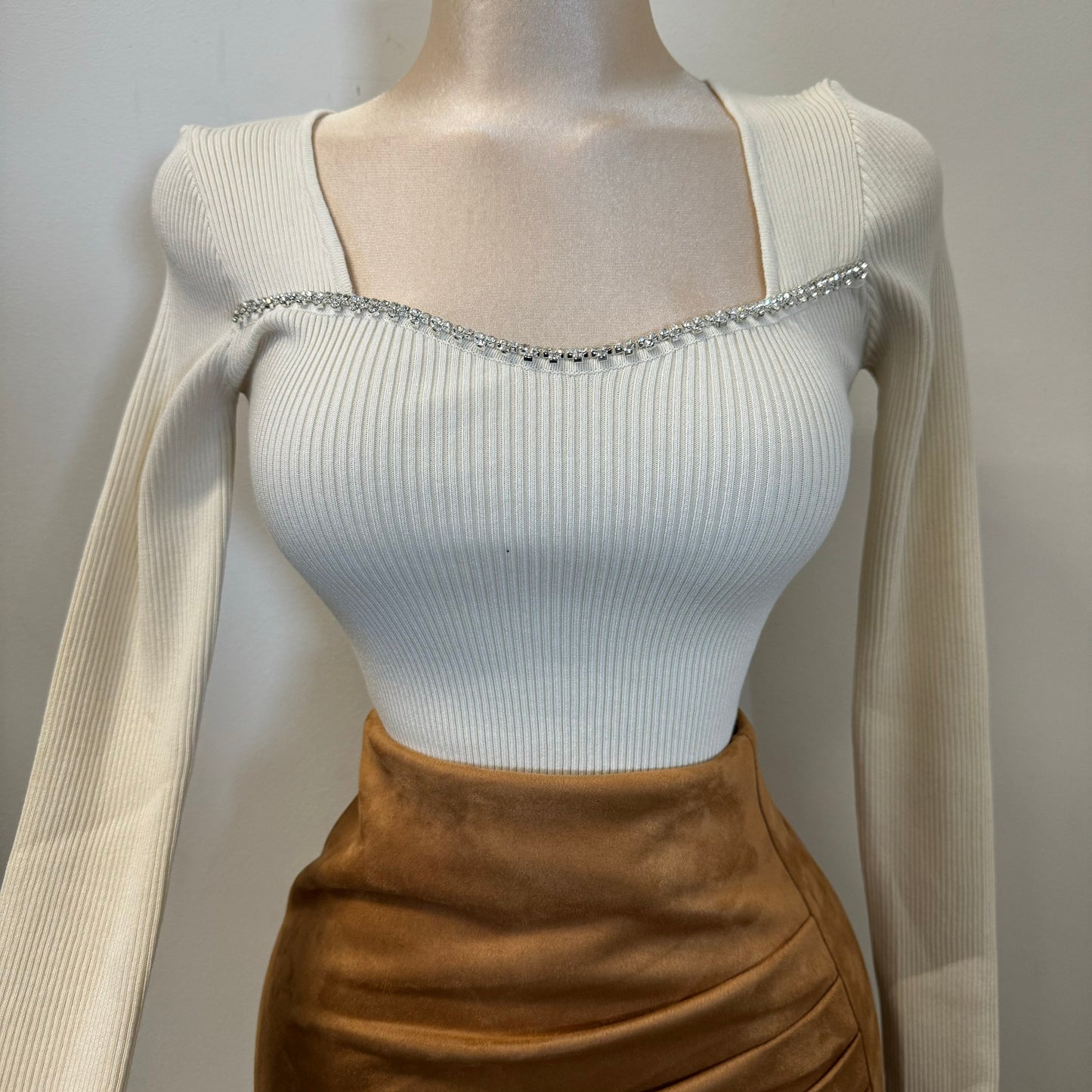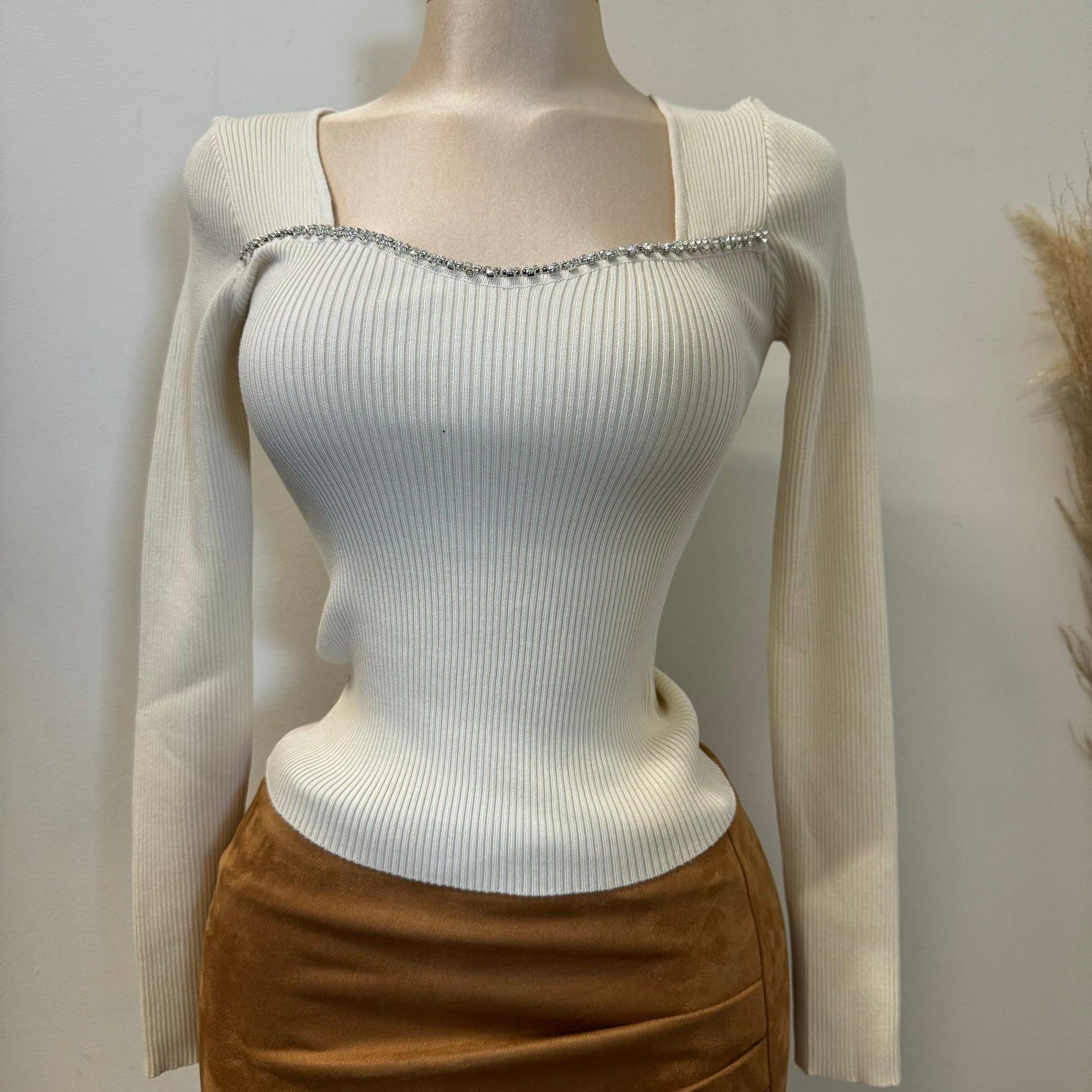 Rhinestone Long Sleeve Knit Sweater-Ivory