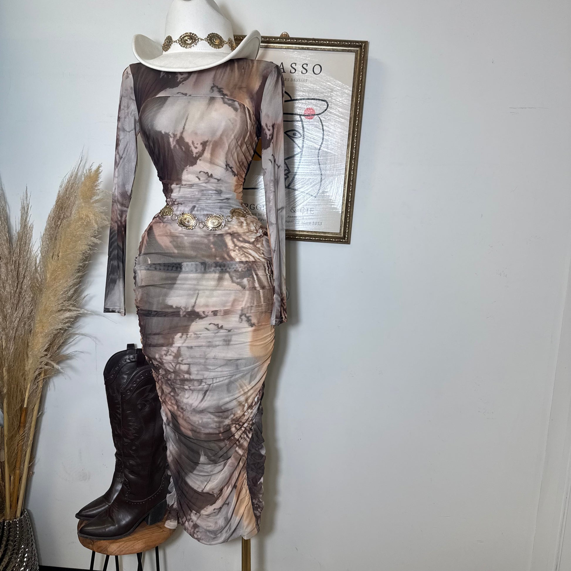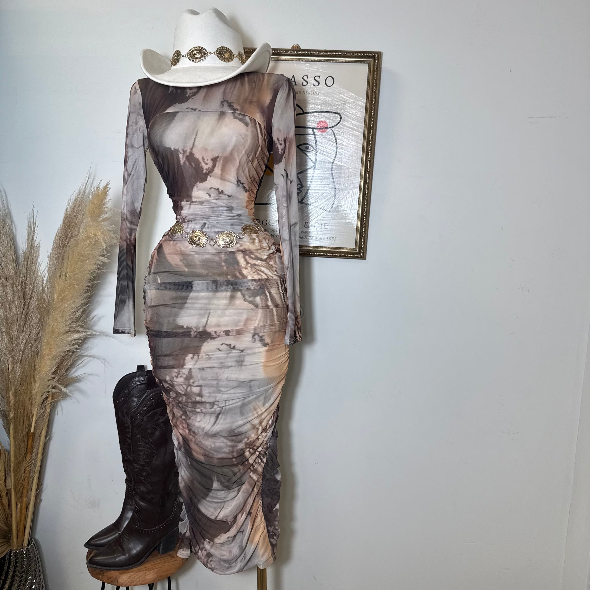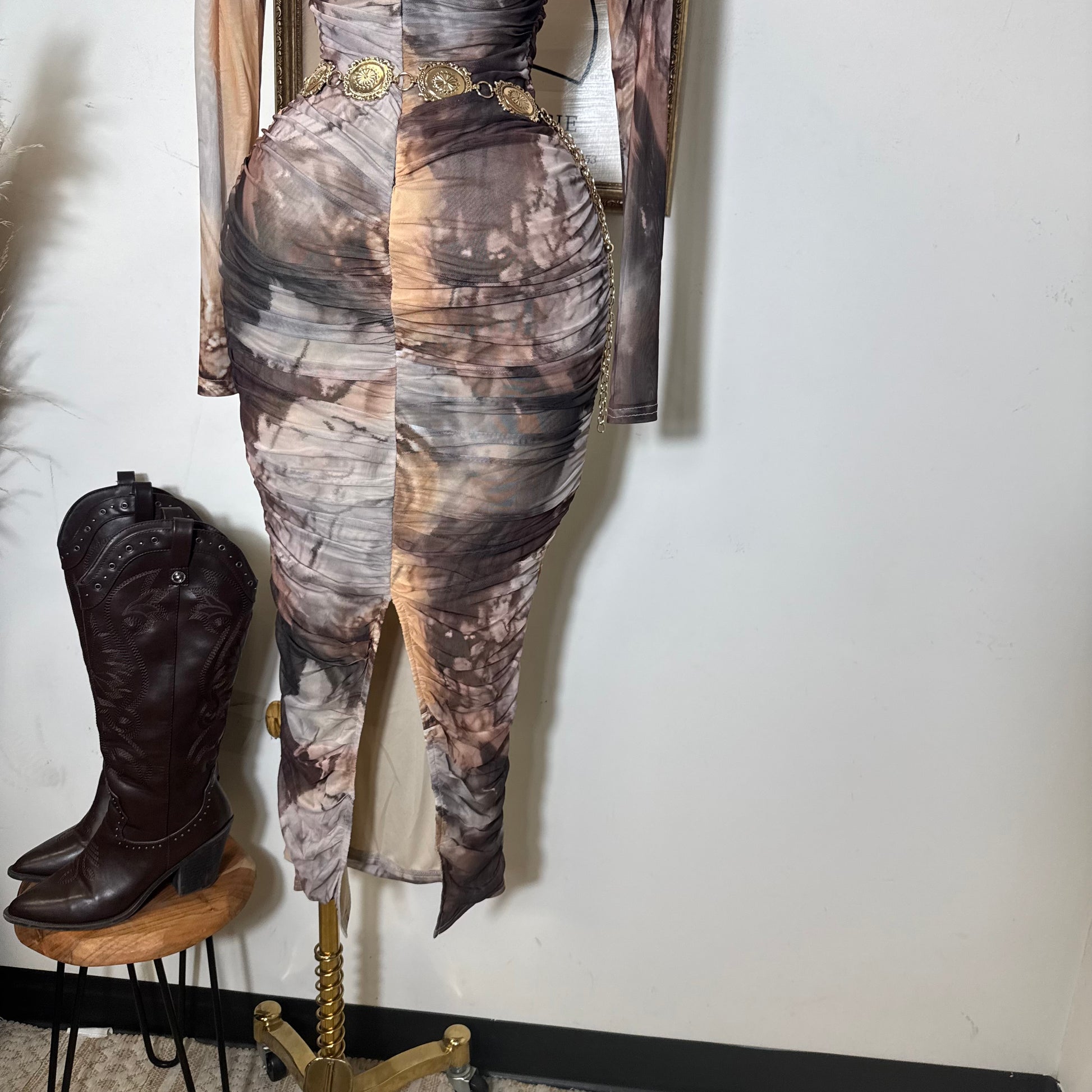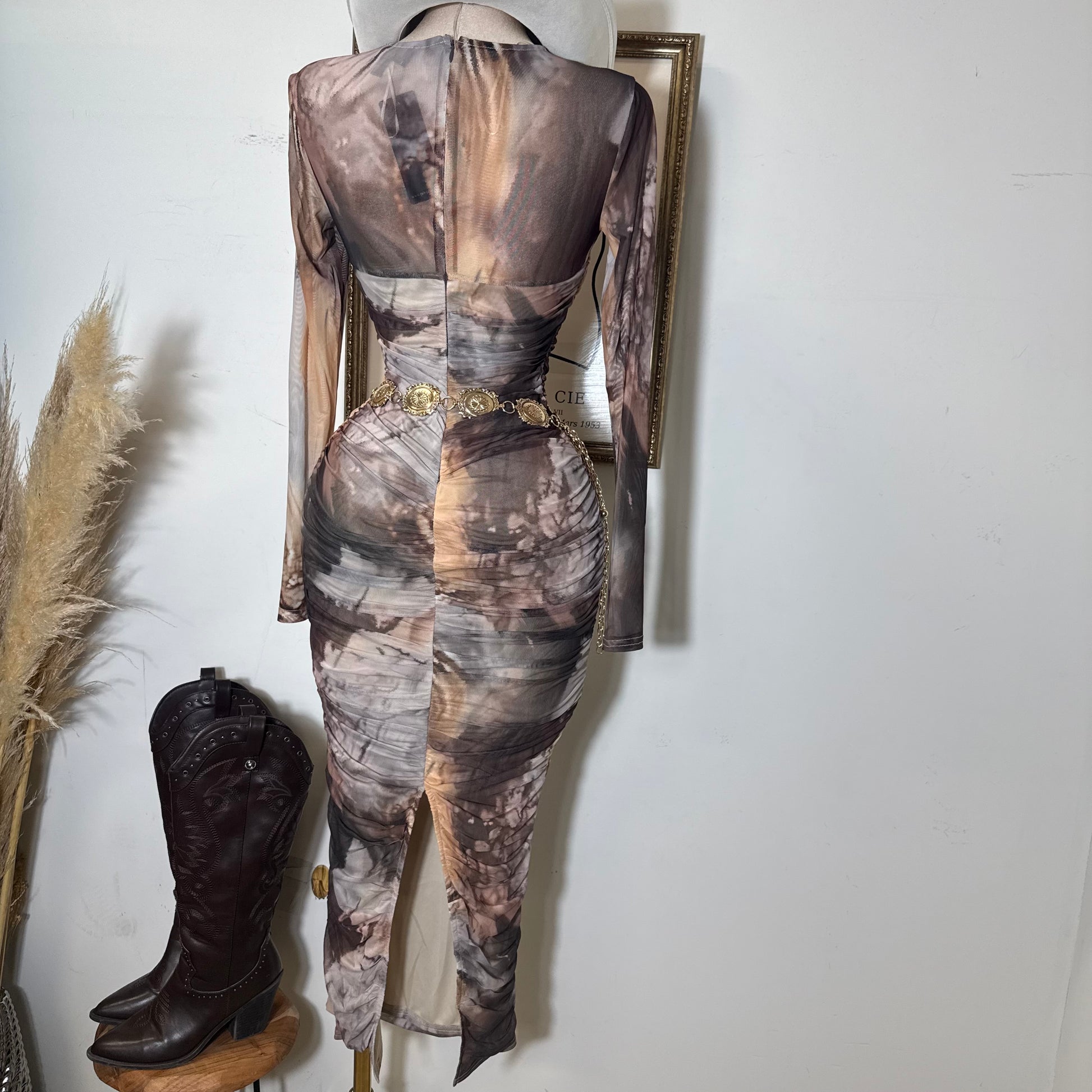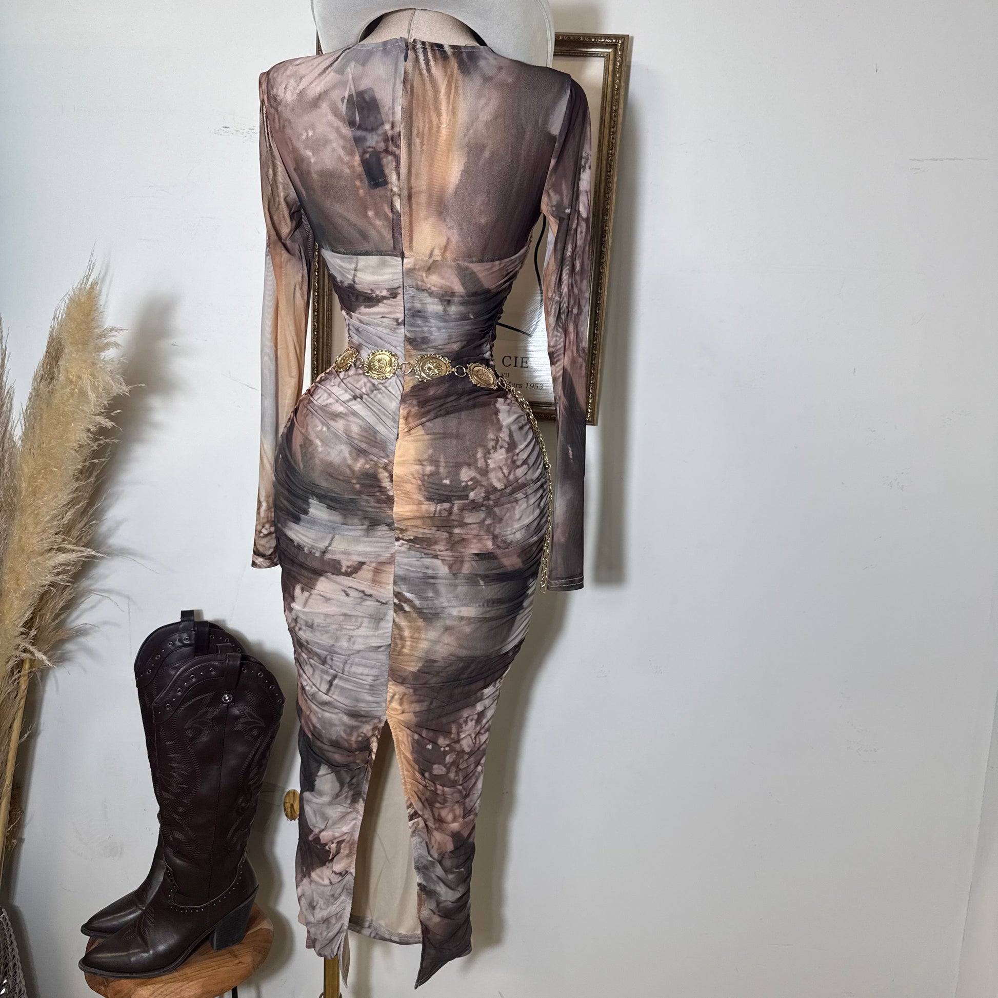 Round Neck Long Sleeve Ruching Midi Dress-Brown Marble
