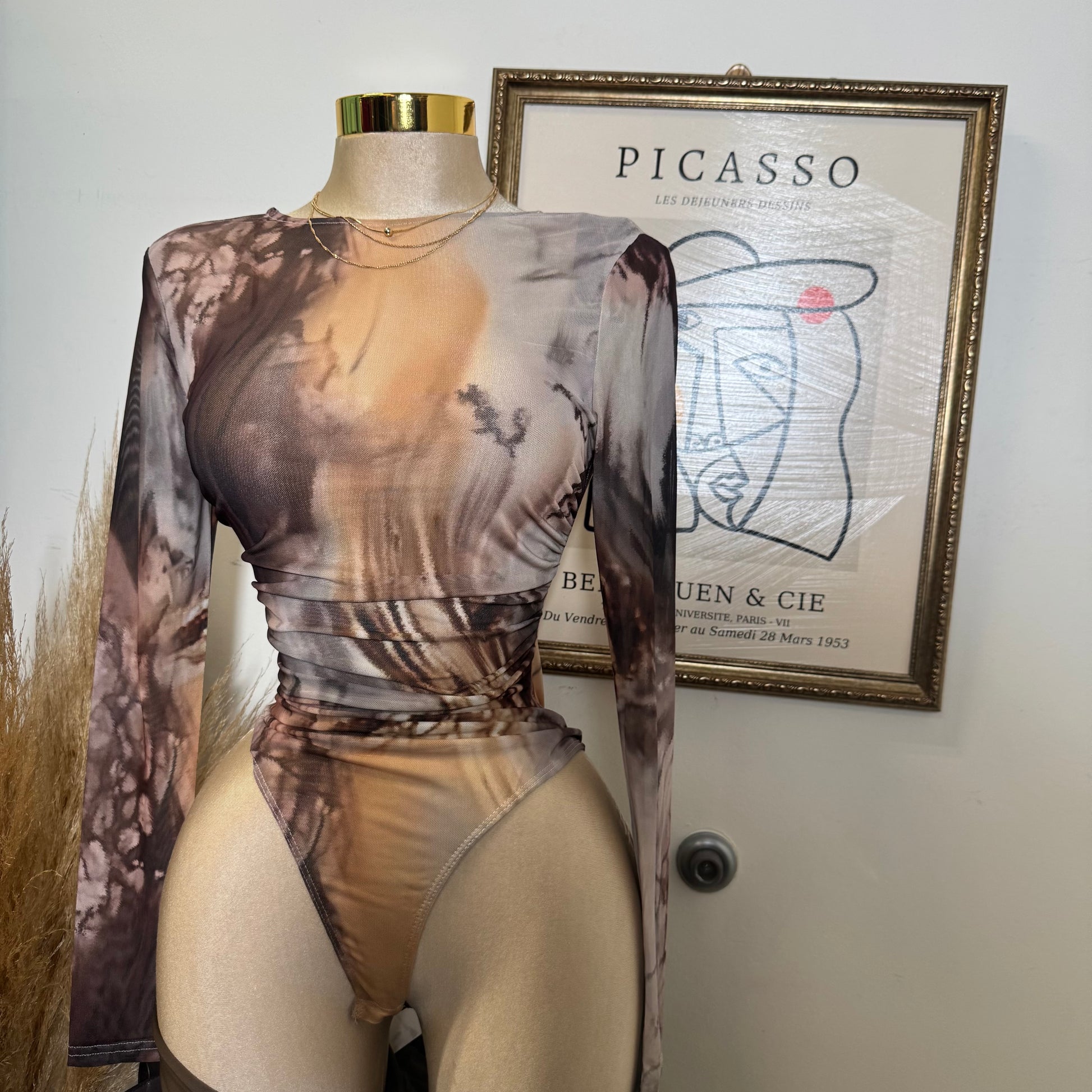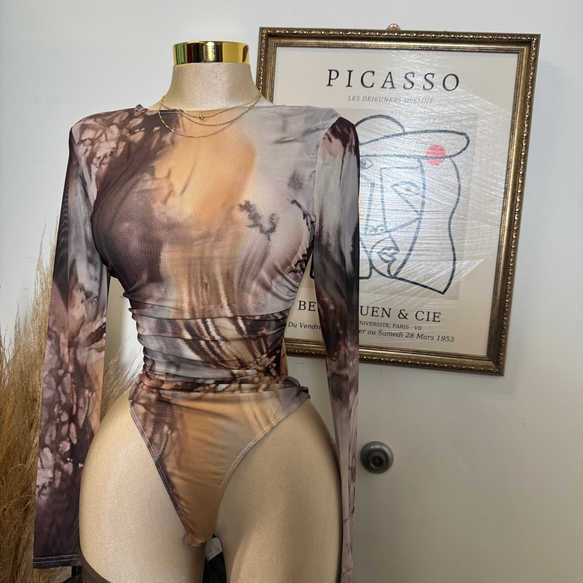 Round Neck Long sleeve Sleeve Bodysuit-Brown Multi