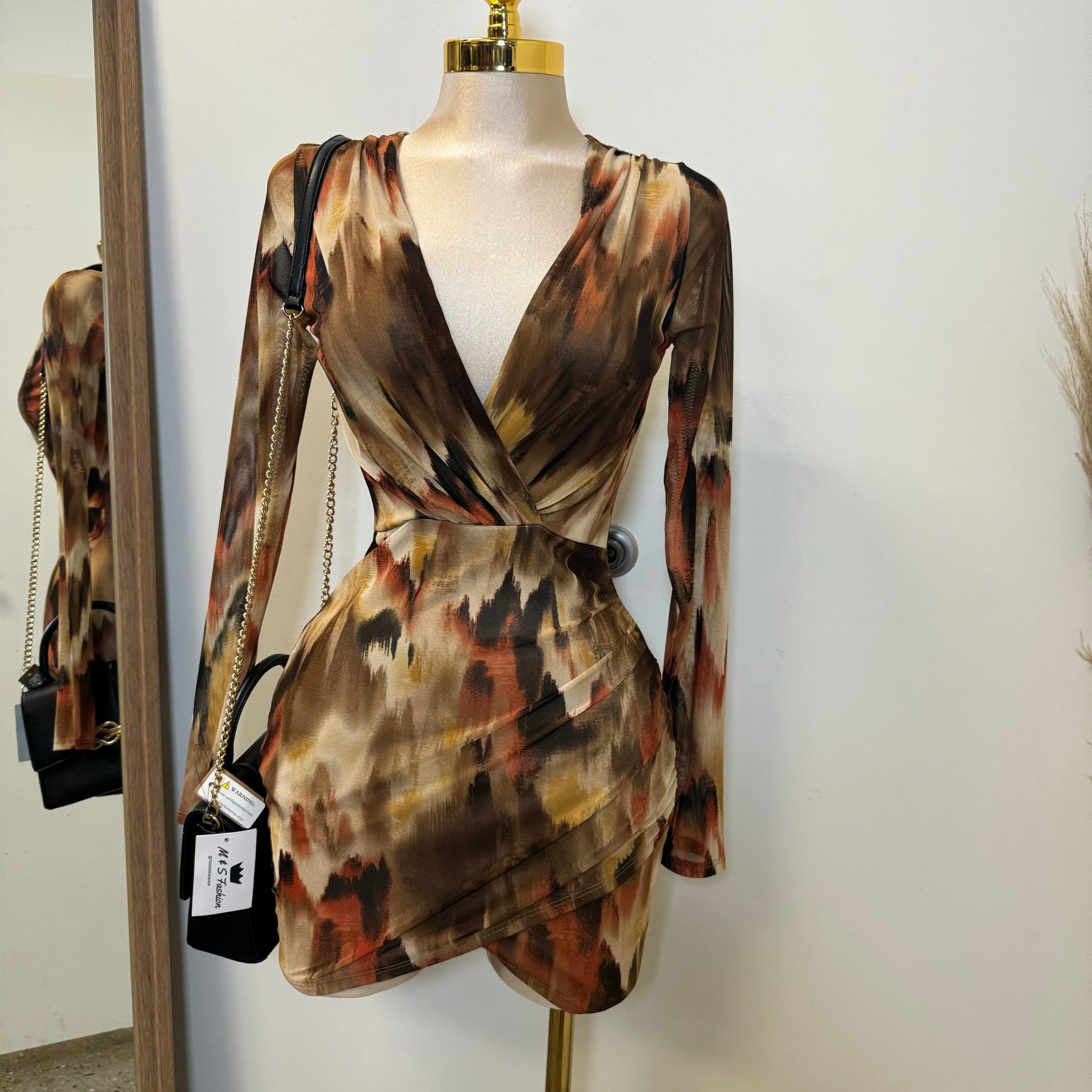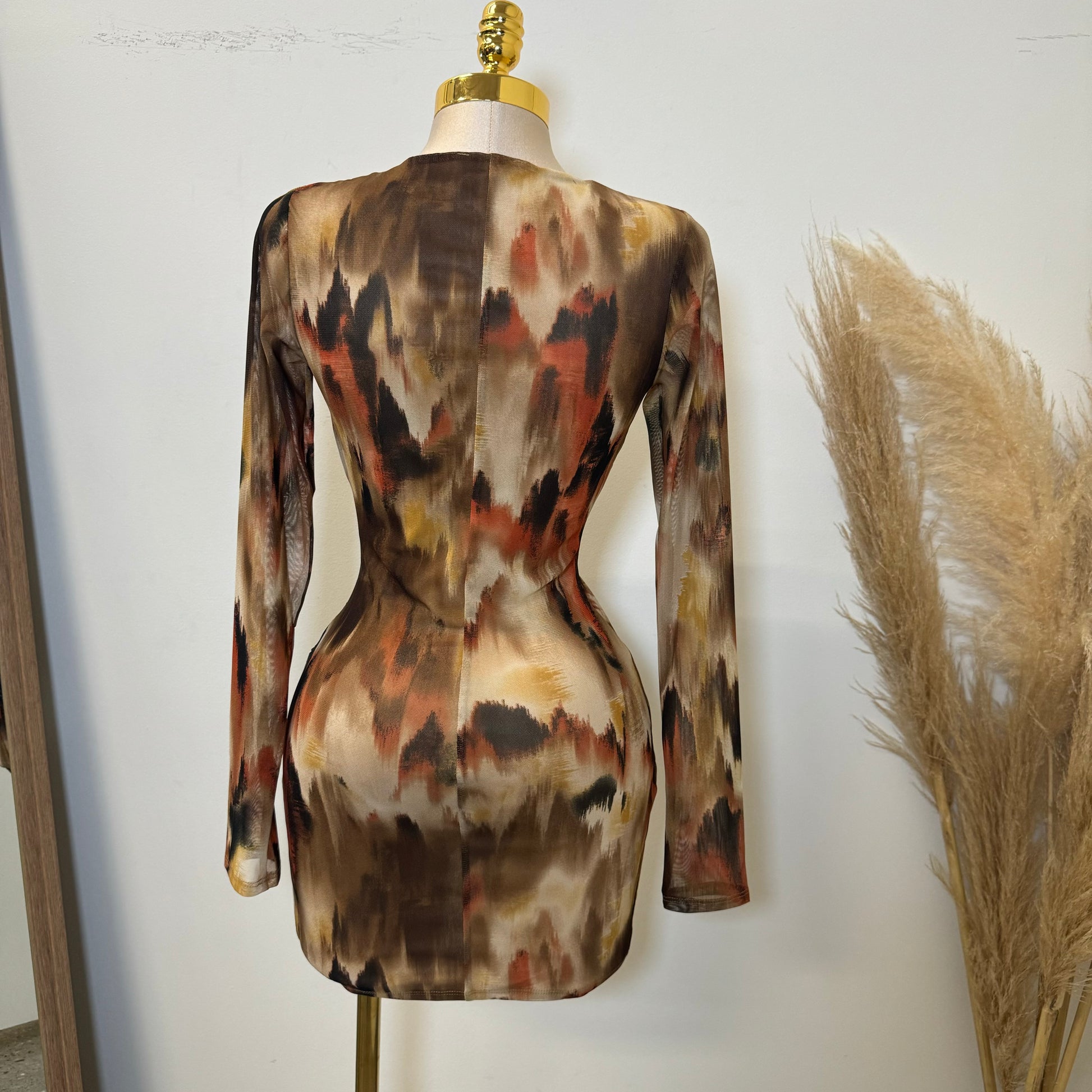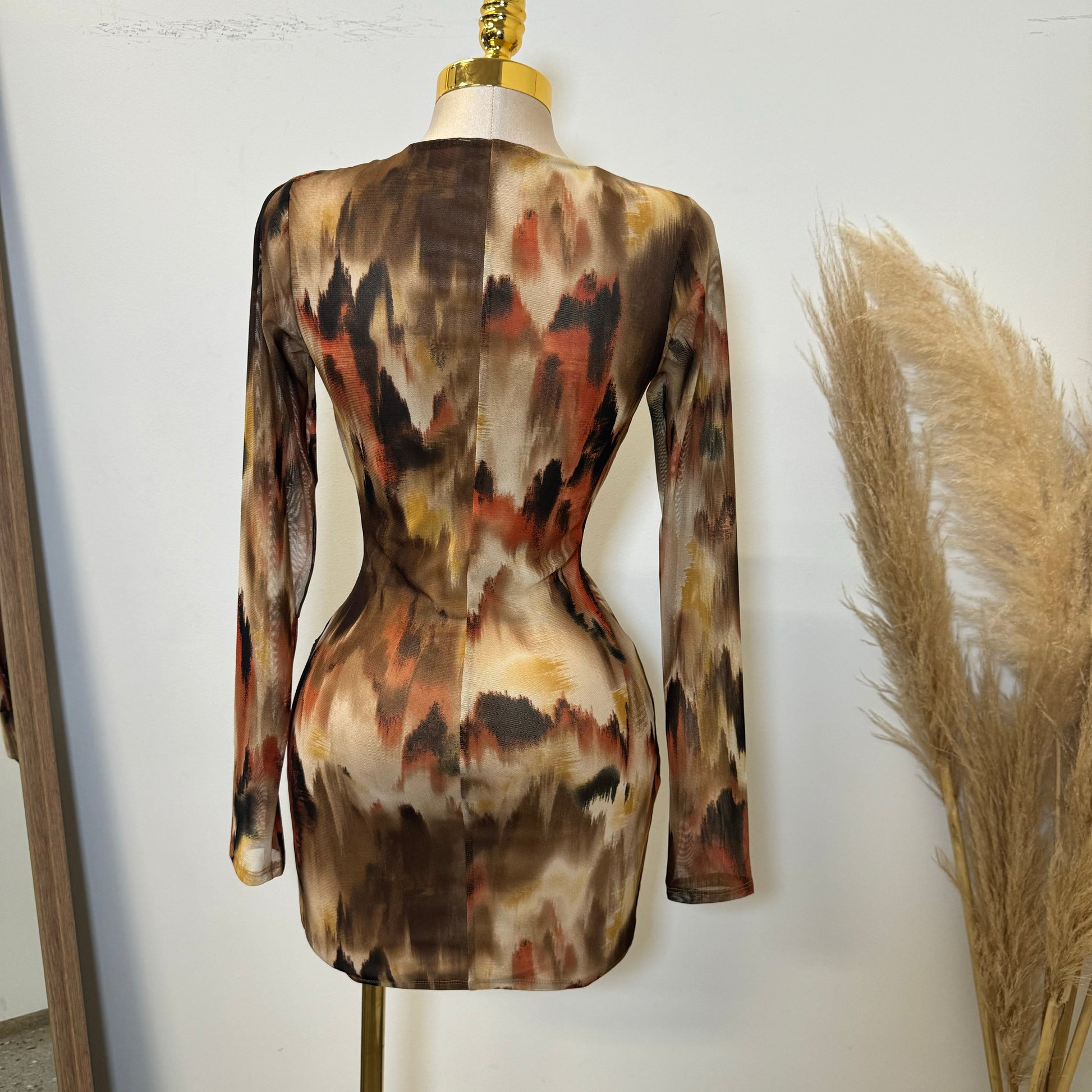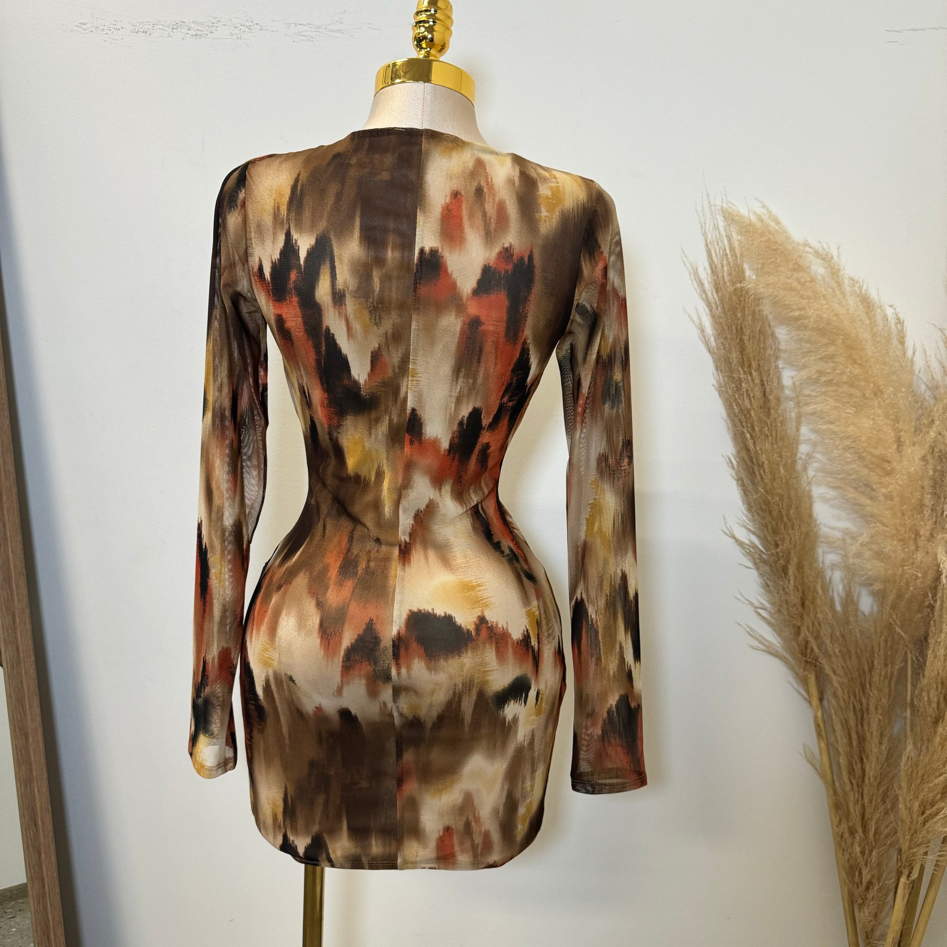 LUXE ABSTRACT PRINT MESH DEEP V-NECK LONG SLEEVES WRAP HEM BODYCON MINI DRESS