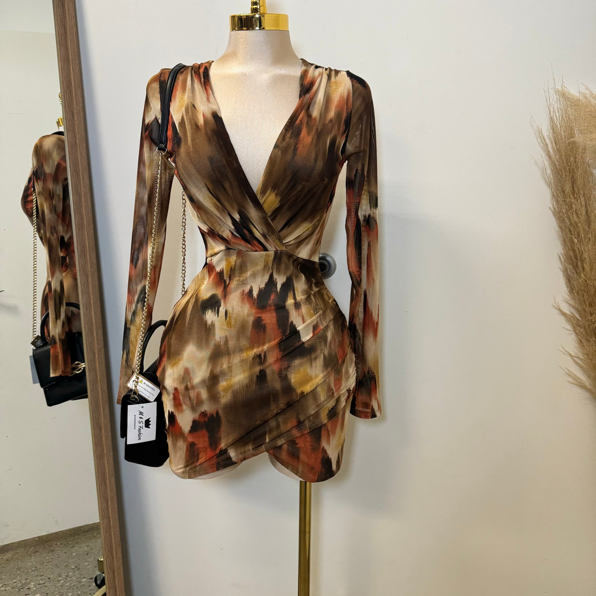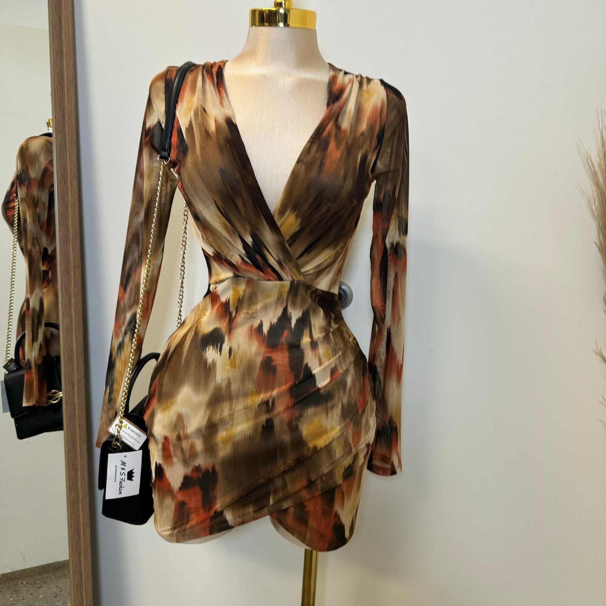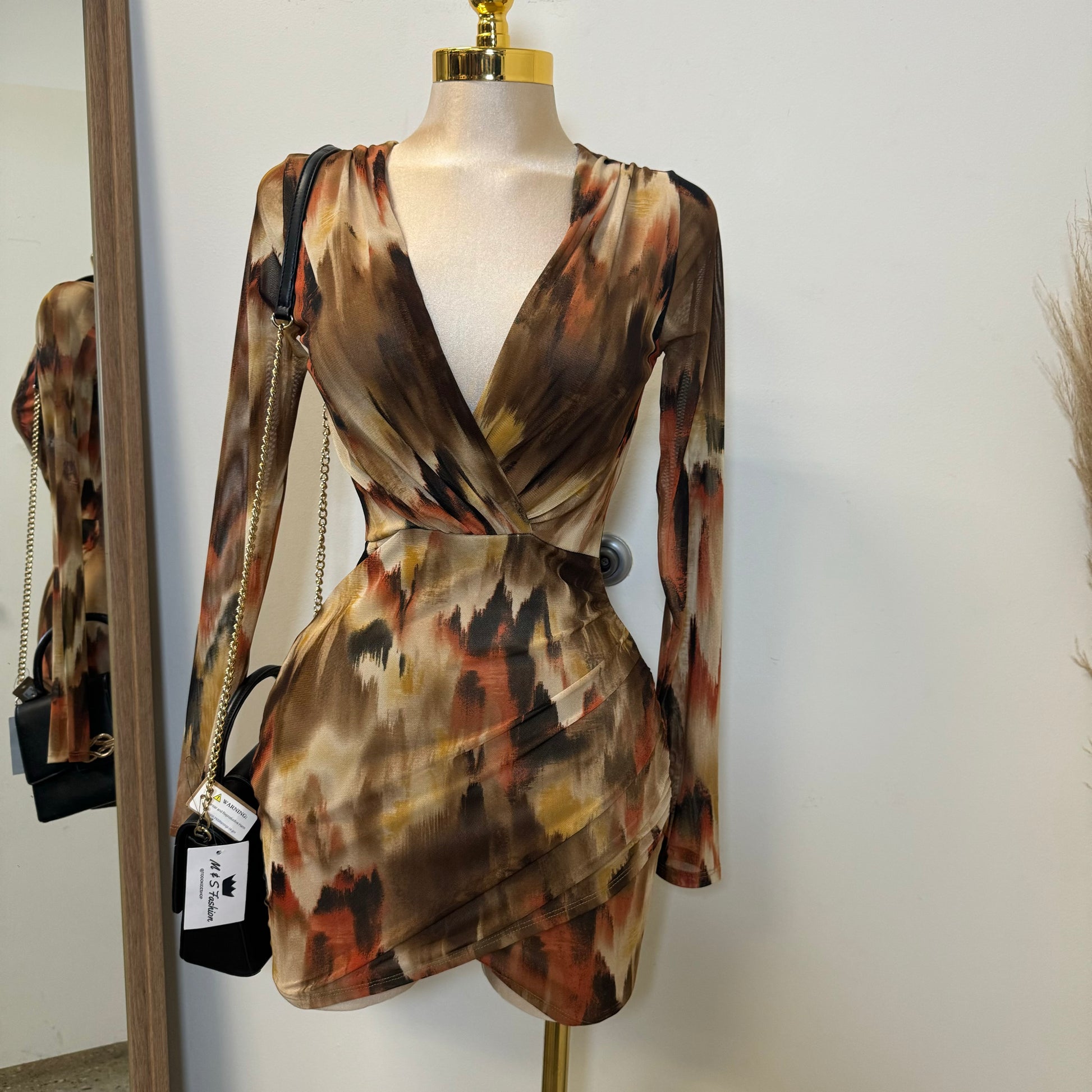 LUXE ABSTRACT PRINT MESH DEEP V-NECK LONG SLEEVES WRAP HEM BODYCON MINI DRESS