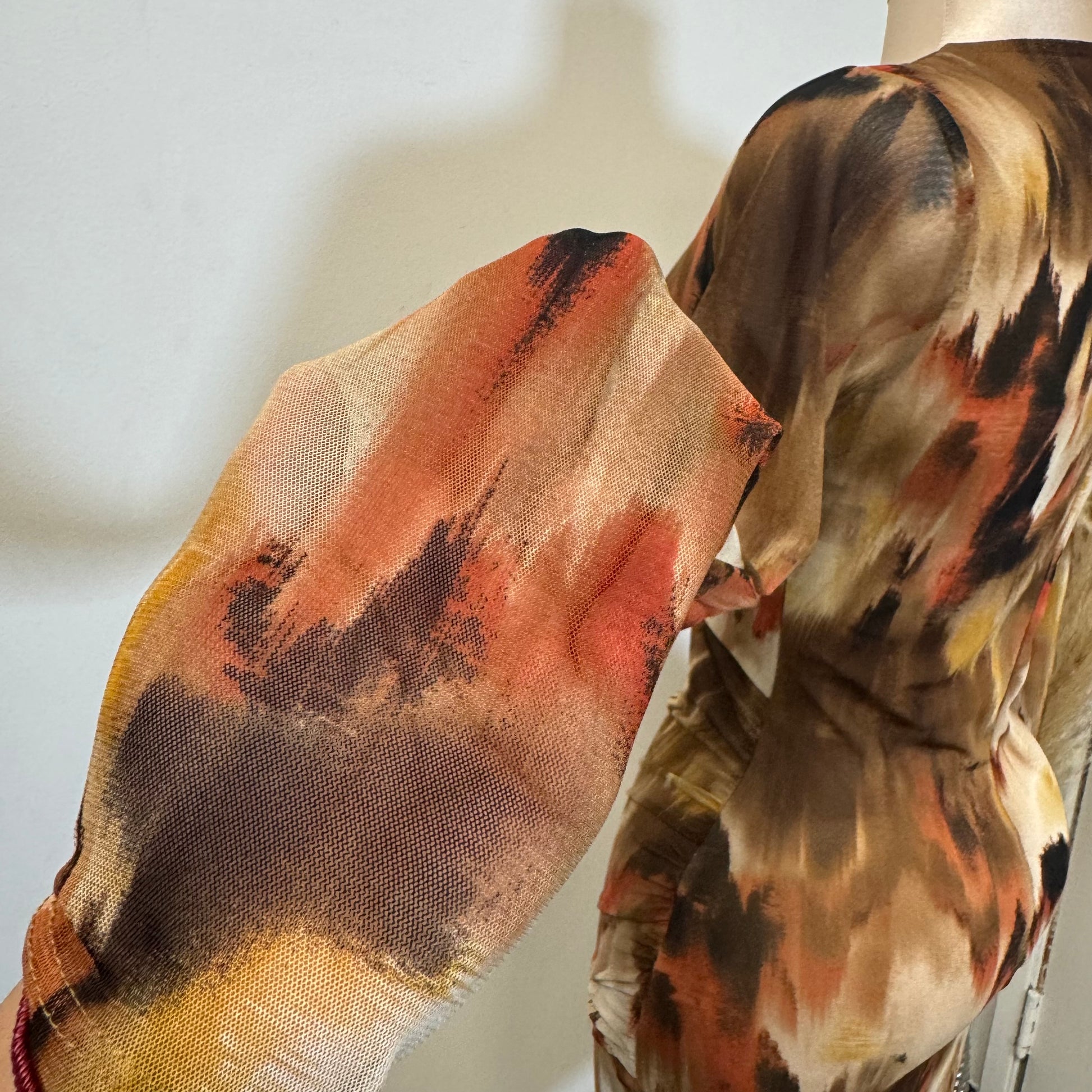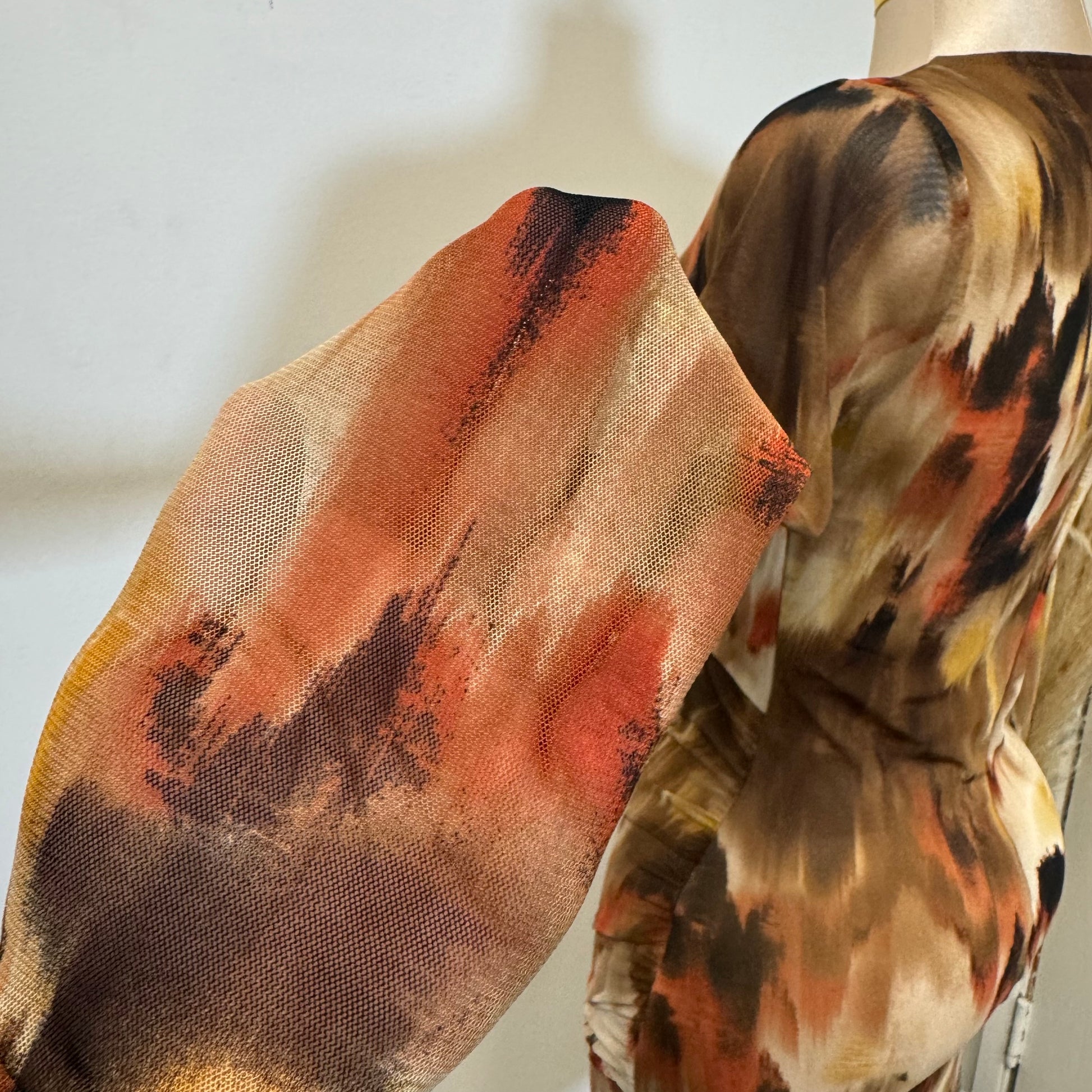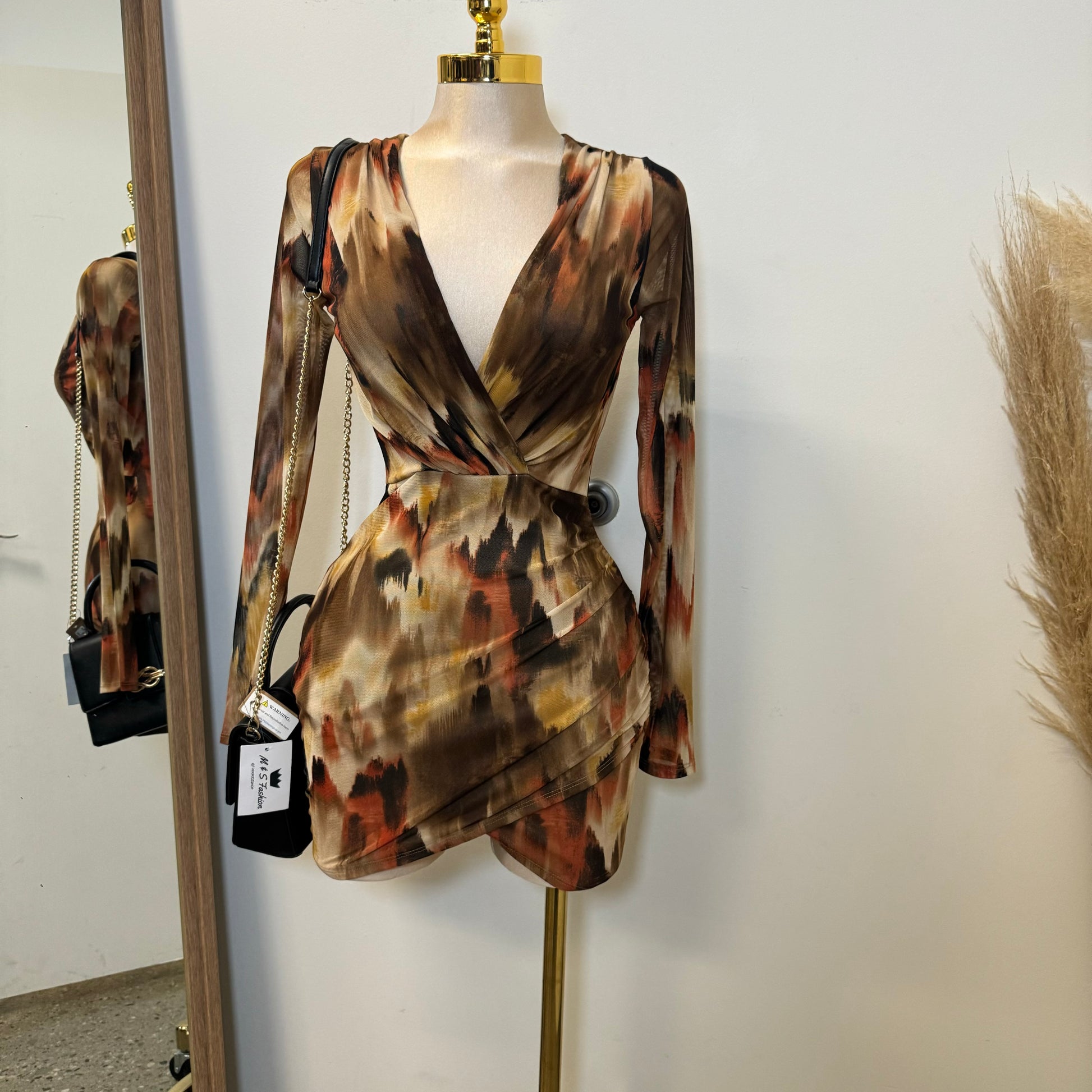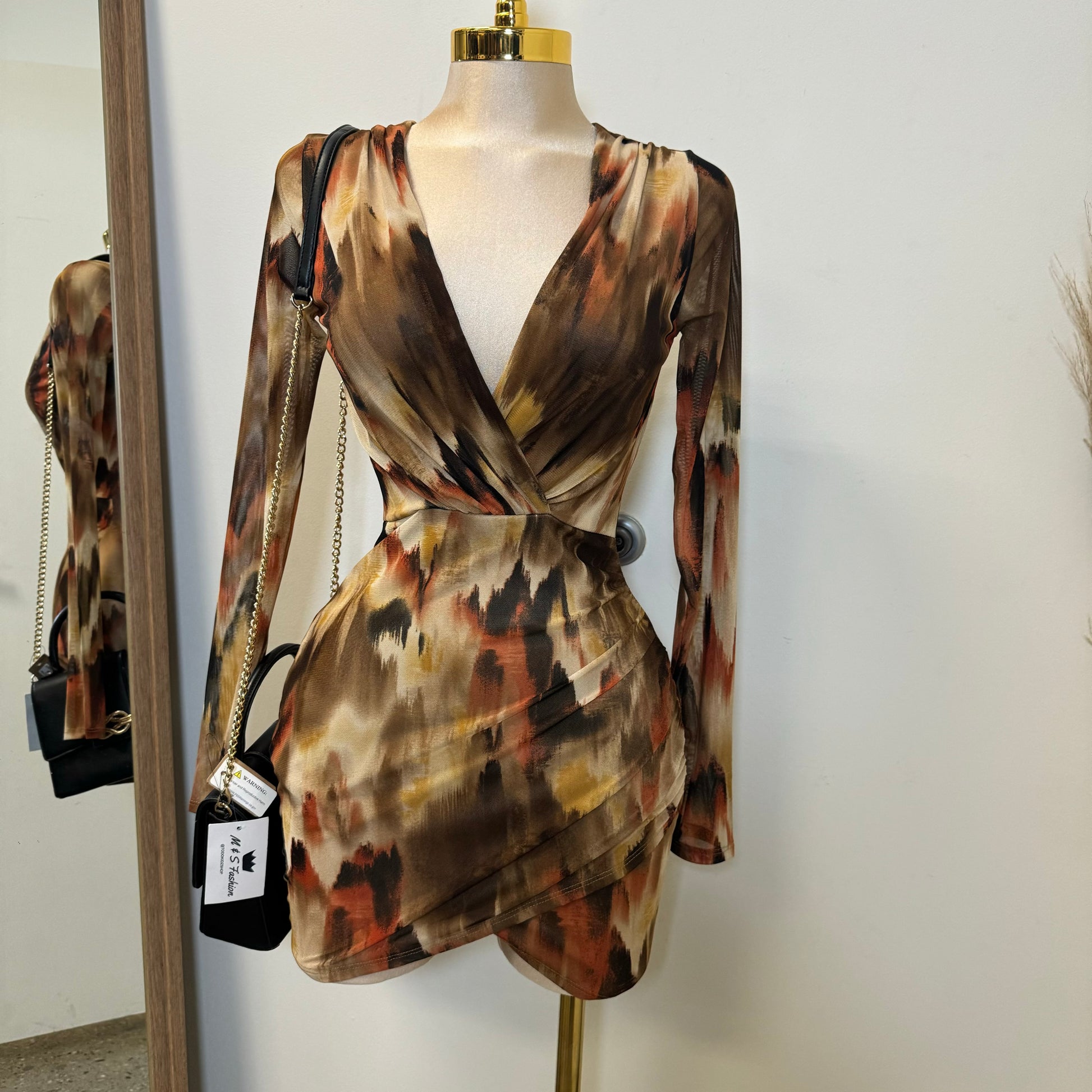 LUXE ABSTRACT PRINT MESH DEEP V-NECK LONG SLEEVES WRAP HEM BODYCON MINI DRESS