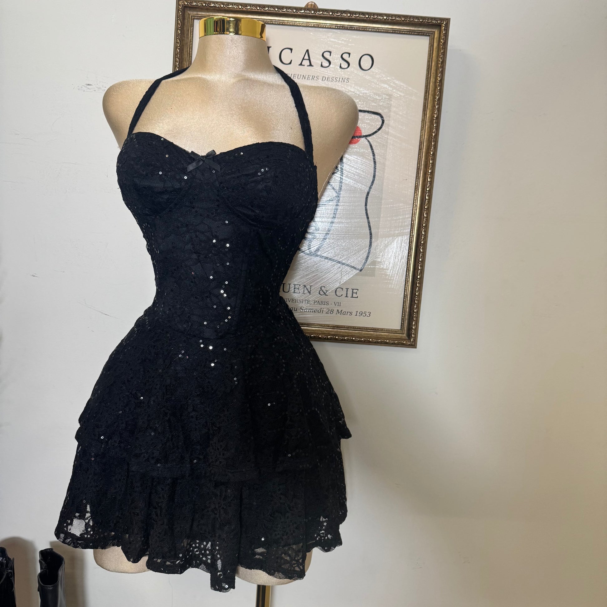 Sequined Halter Mini Dress with Tiered Skirt-Black
