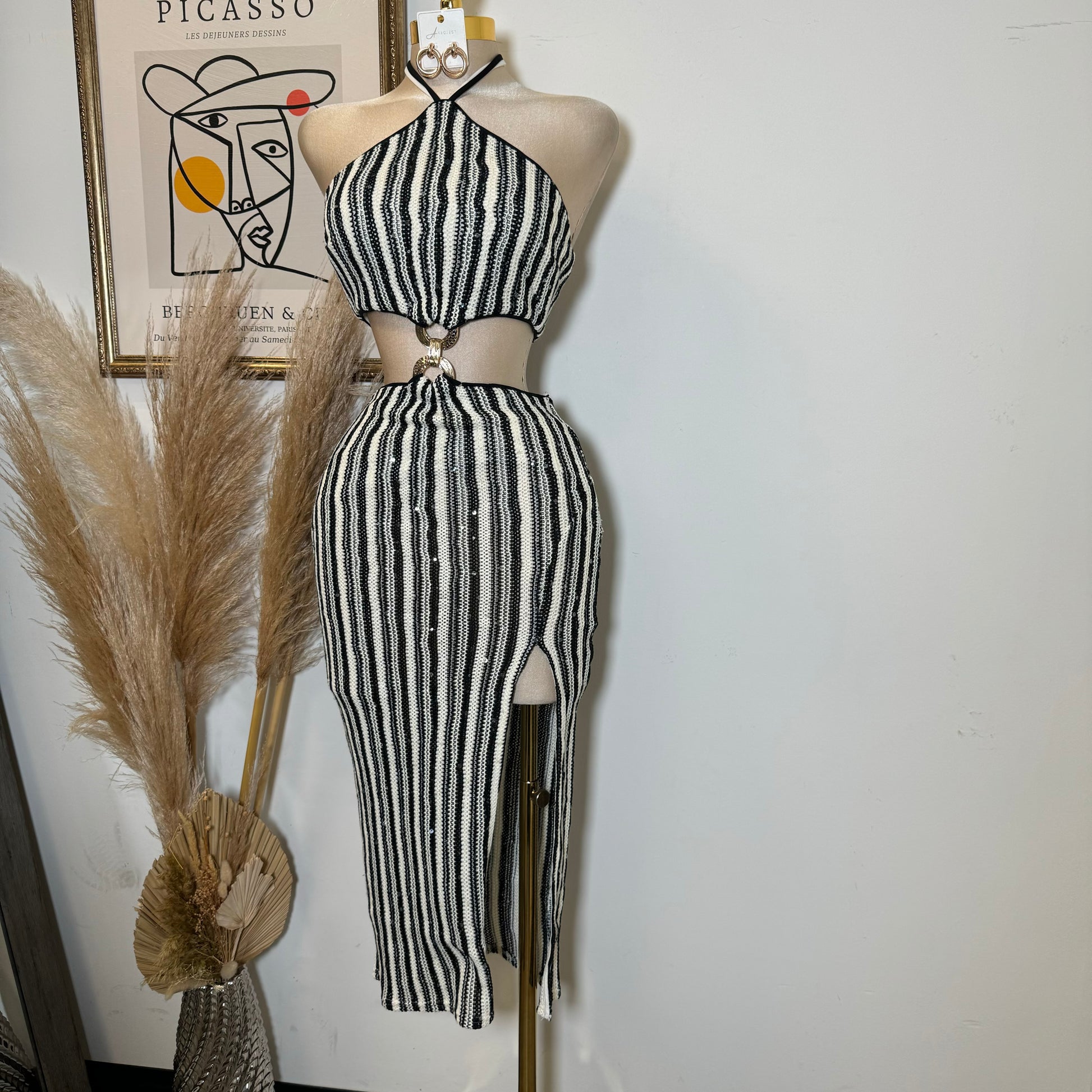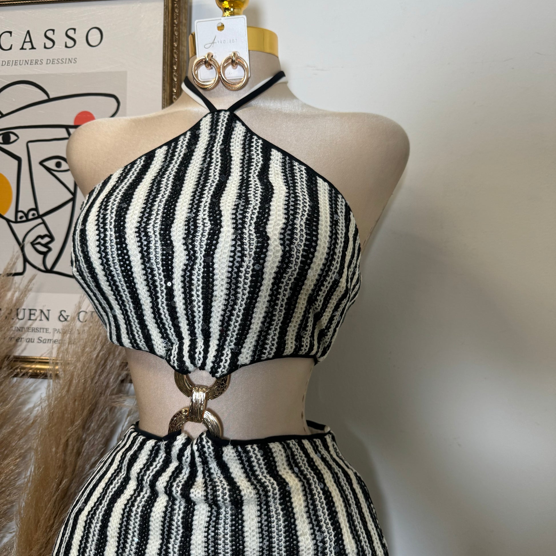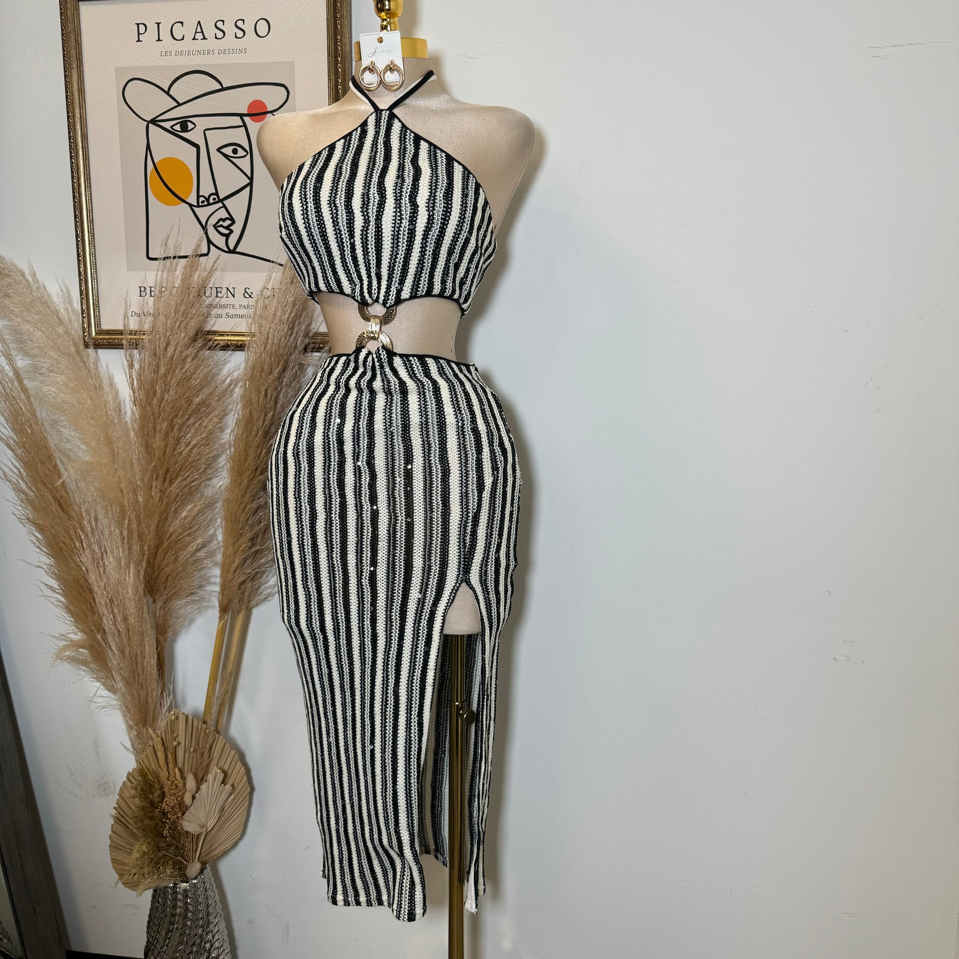 Expertly crafted midi dress featuring a sophisticated cut-out waist design and elegant tie neck detail. The solid cut and sew knit construction offers a flattering silhouette while ensuring comfort and durability. Perfect for both casual outings and semi-formal occasions, this versatile piece effortlessly elevates your wardrobe with its timeless appeal.