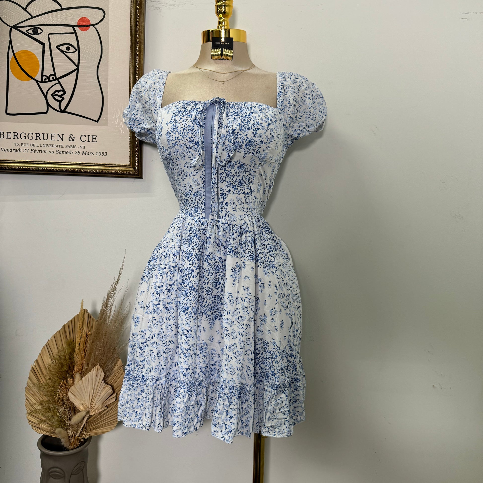 Square Neck Floral Corset Dress-Blue