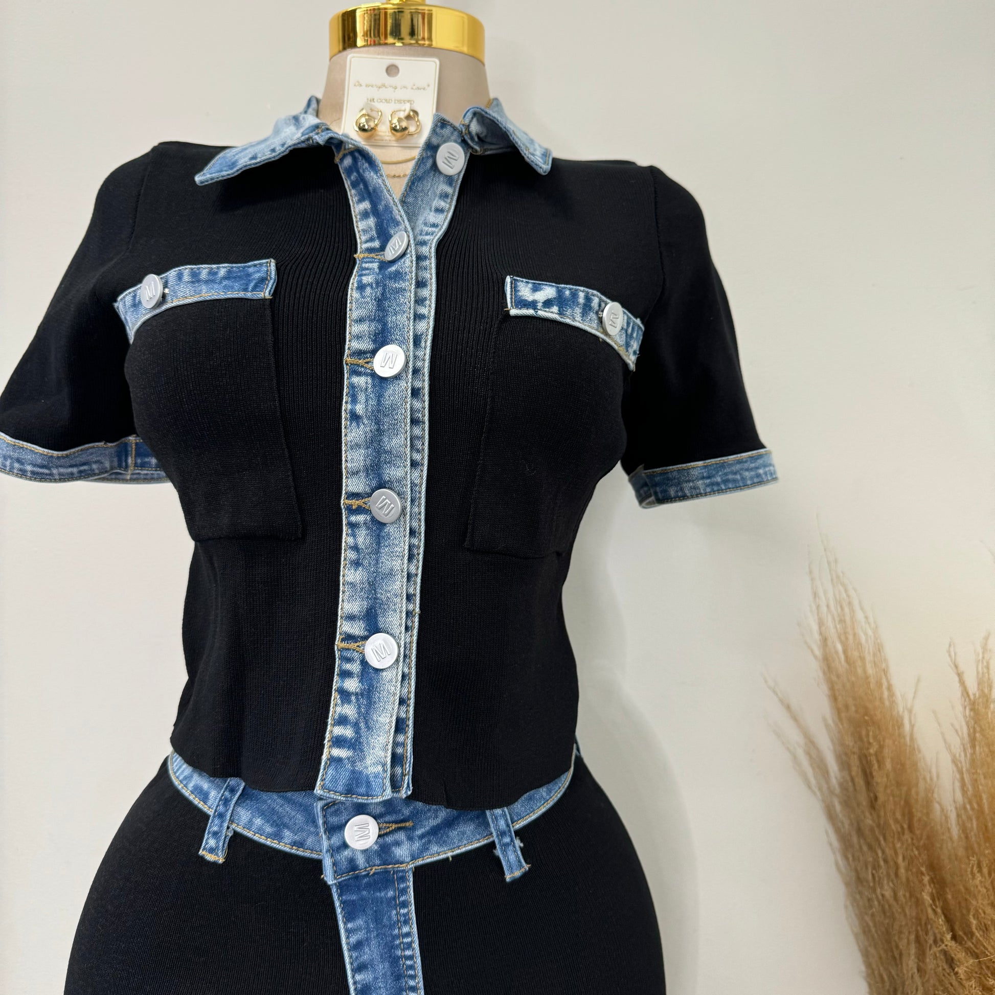 Street Chic Contrast Ribbed Denim Pant Set-black