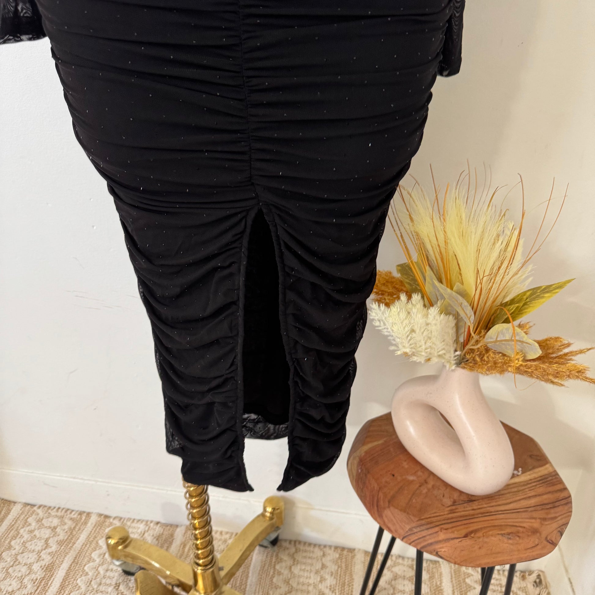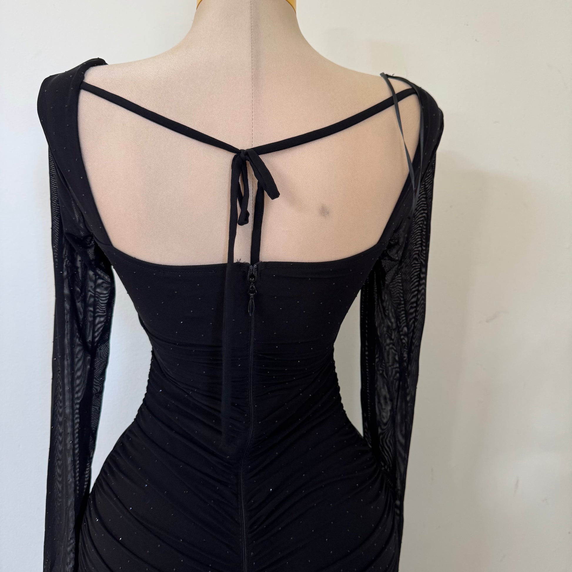 Sweet Heart Long Sleeve Rucing Rhinestone Midi Dress- Black