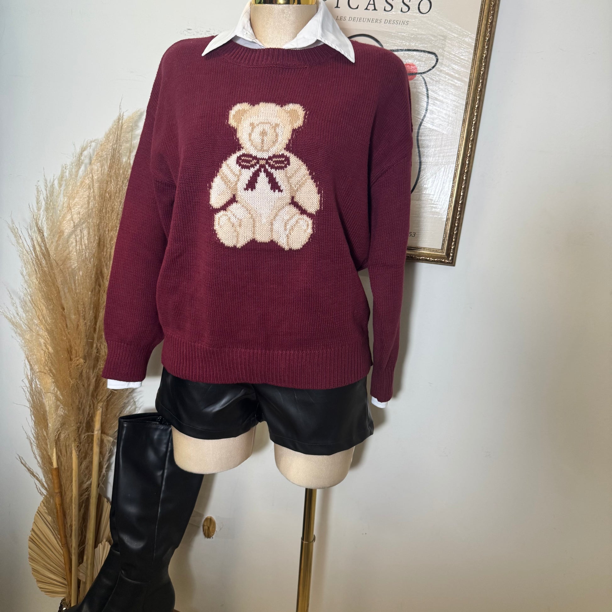 Teddy Jacquard Crew Neck Knit Pullover Sweater-Burgundy