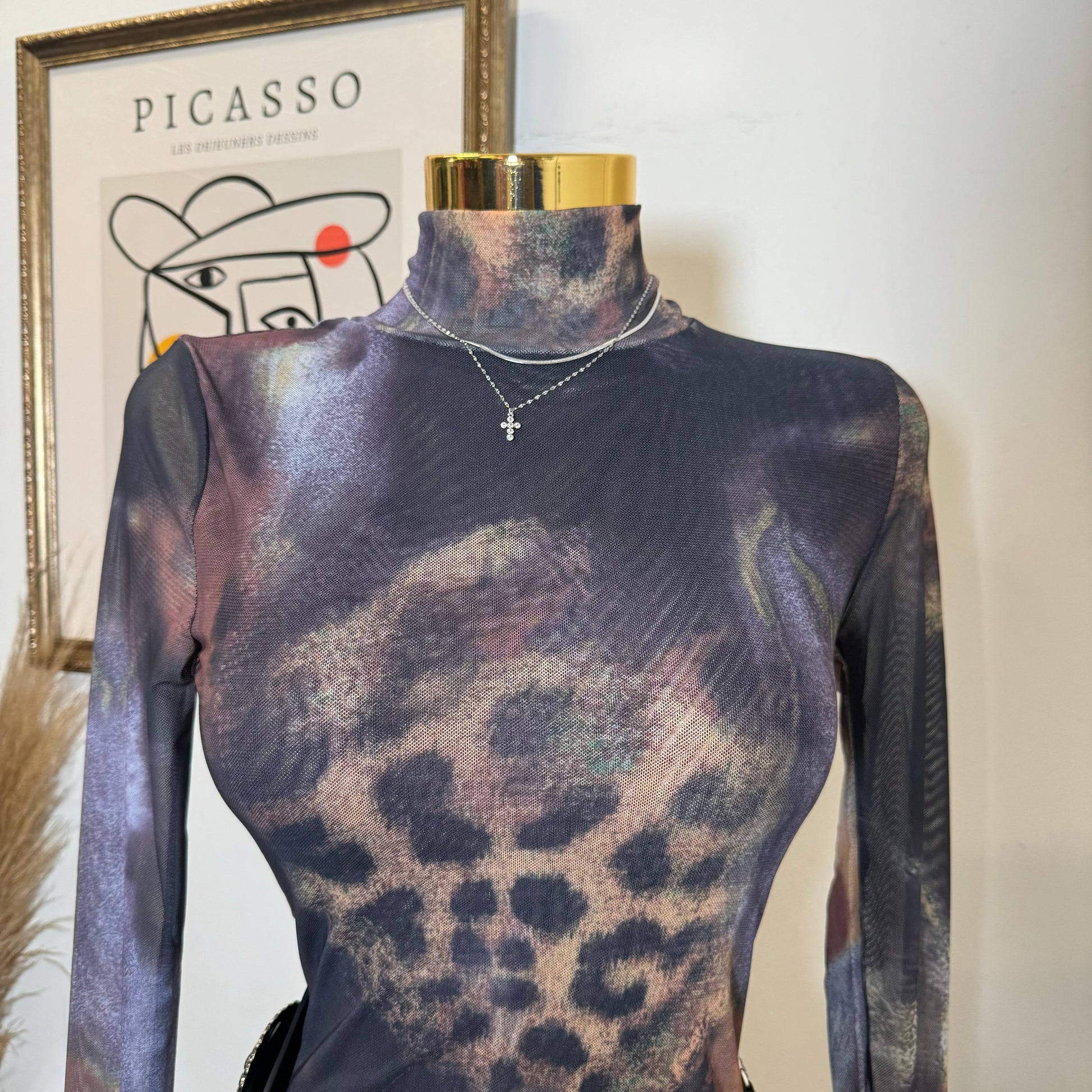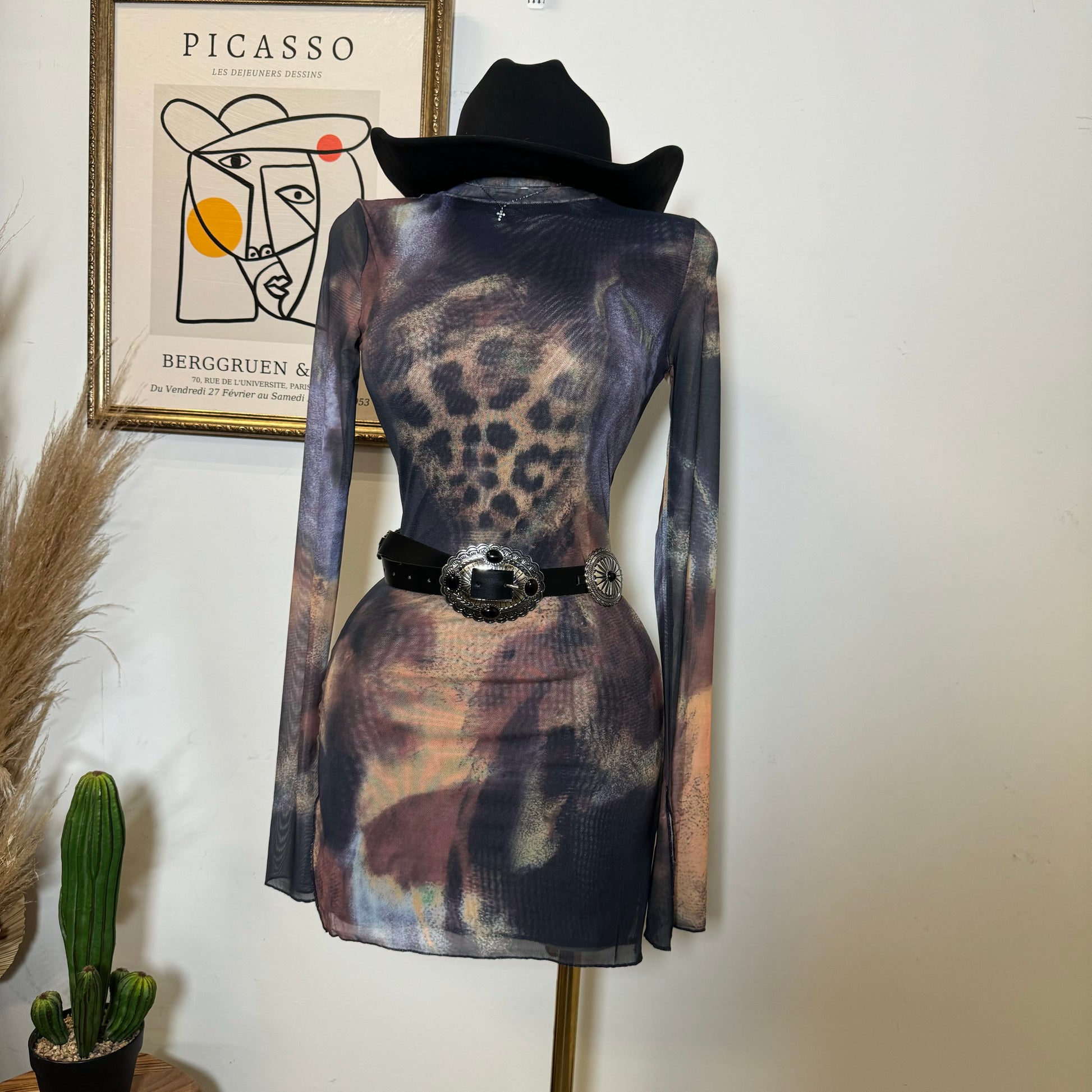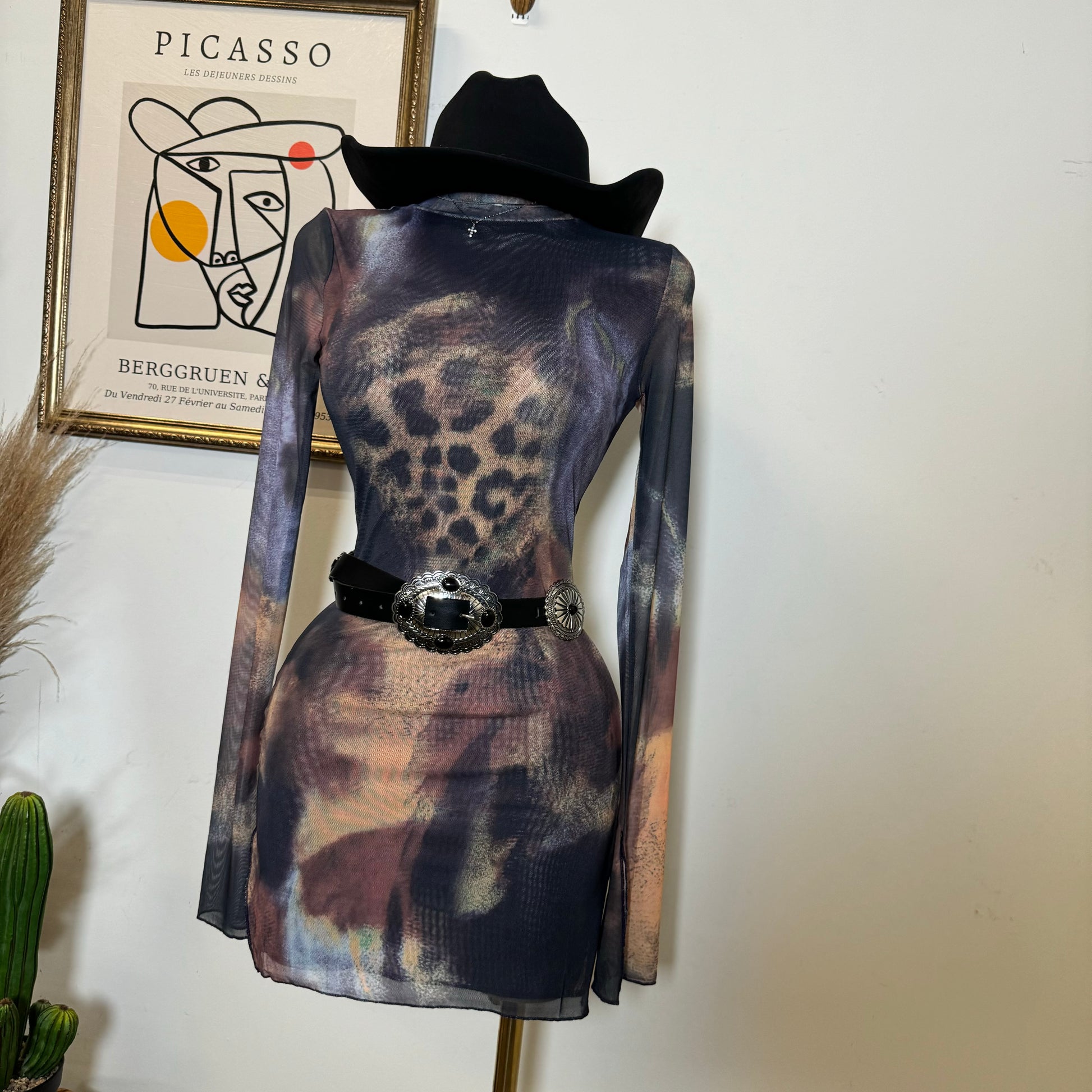 TORY Mesh Long Sleeve Dress-Multi Cheetah Print