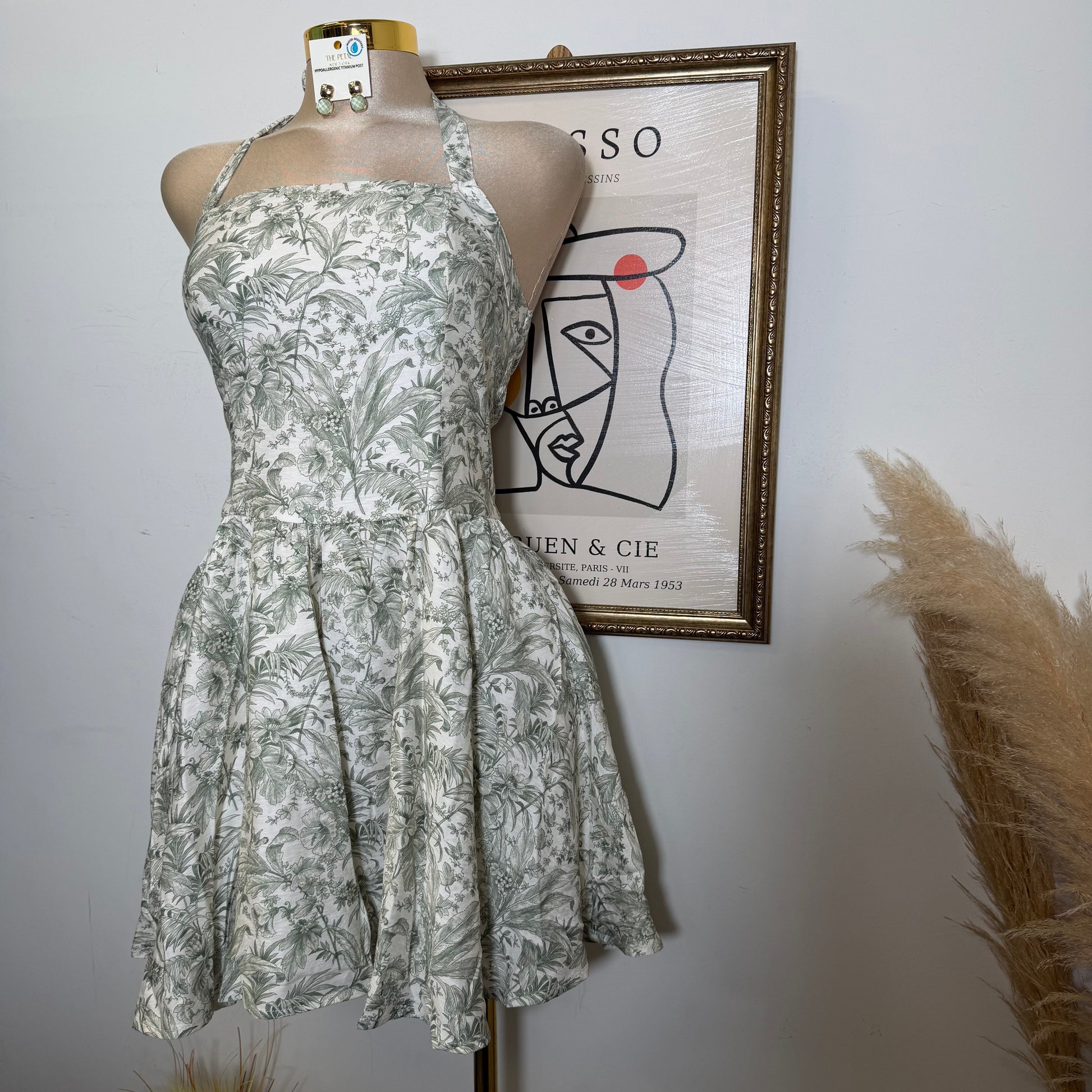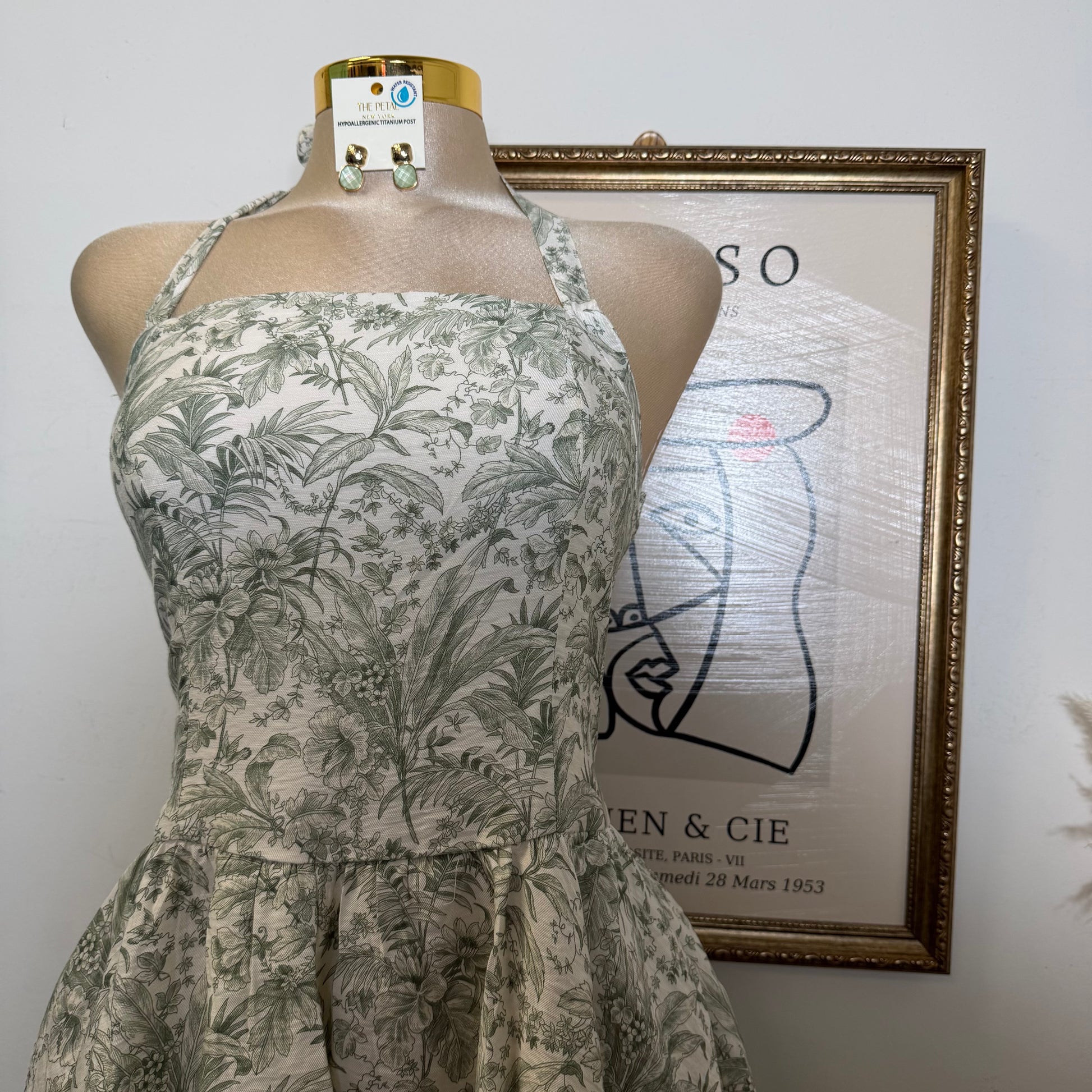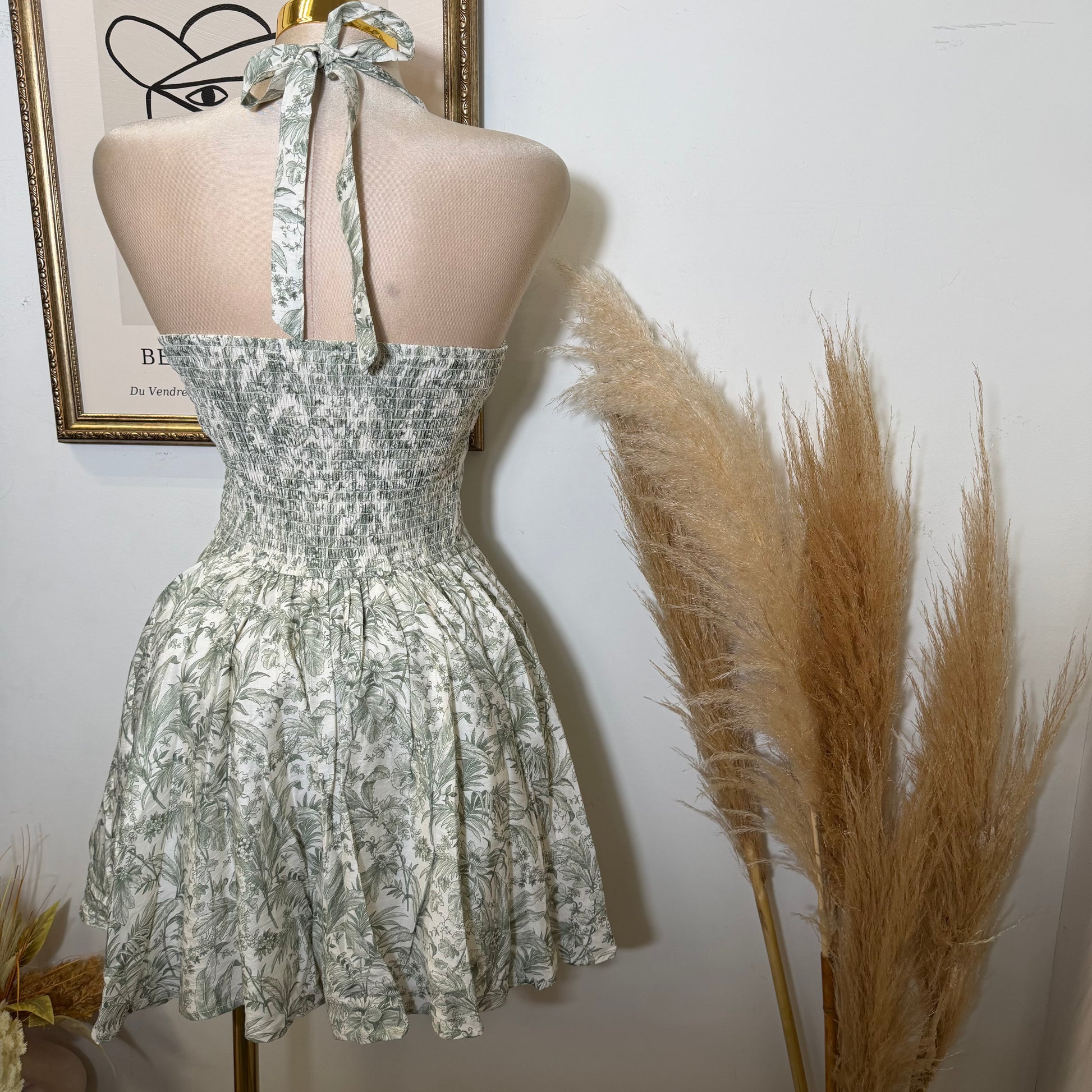 Tropical Toile Halter Mini Dress-Beige/Olive