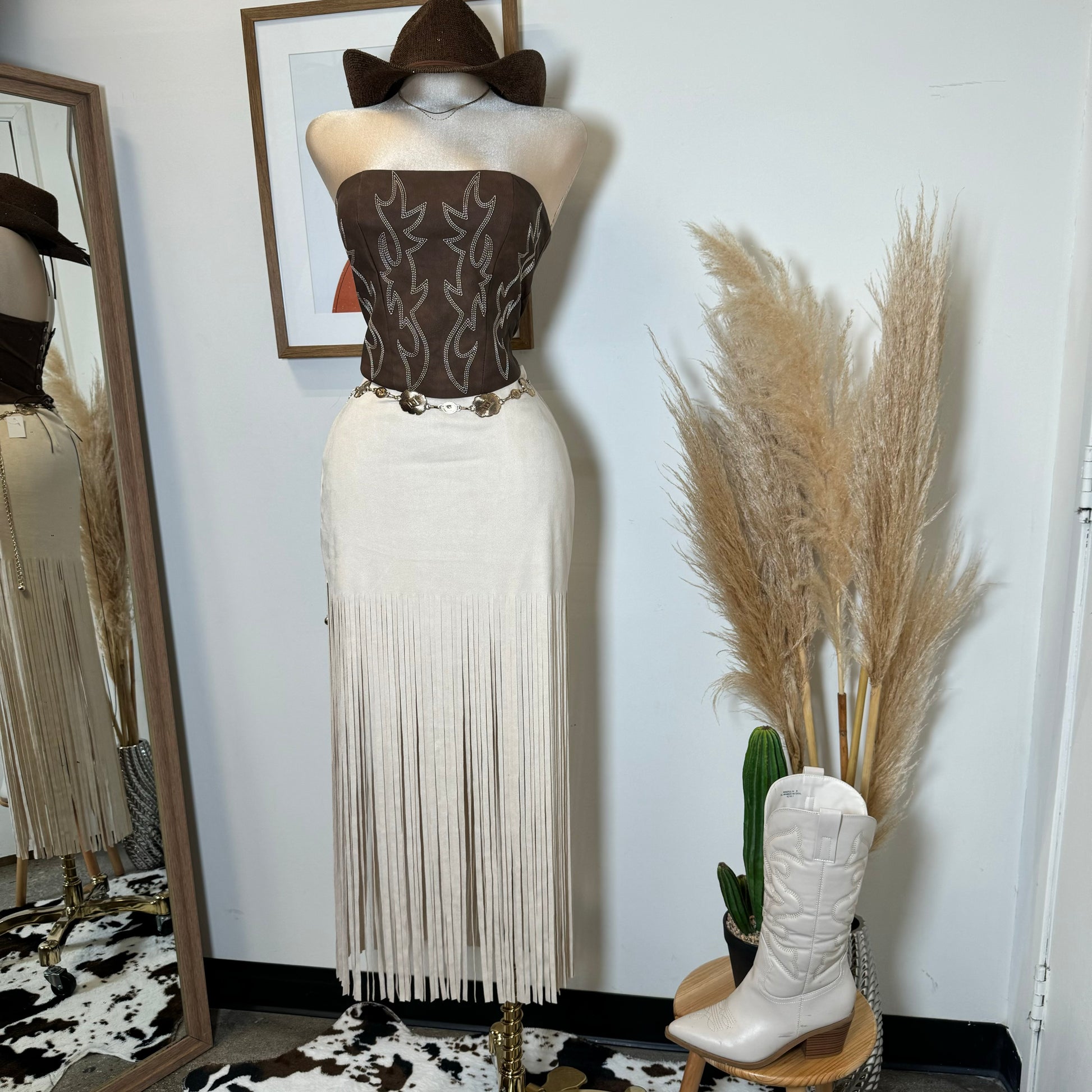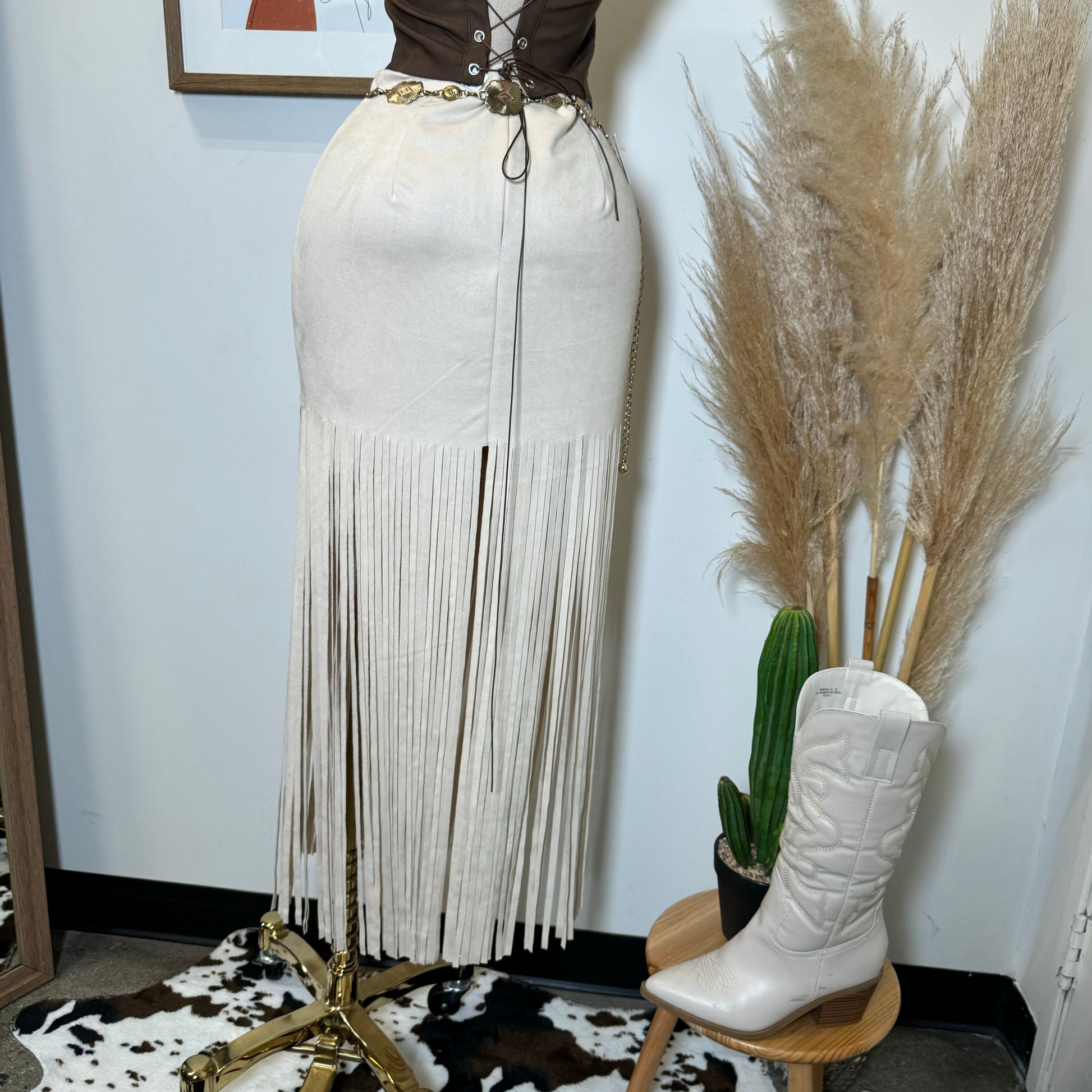 -Medium Rise Suede Knit Maxi Skirt with long fringe