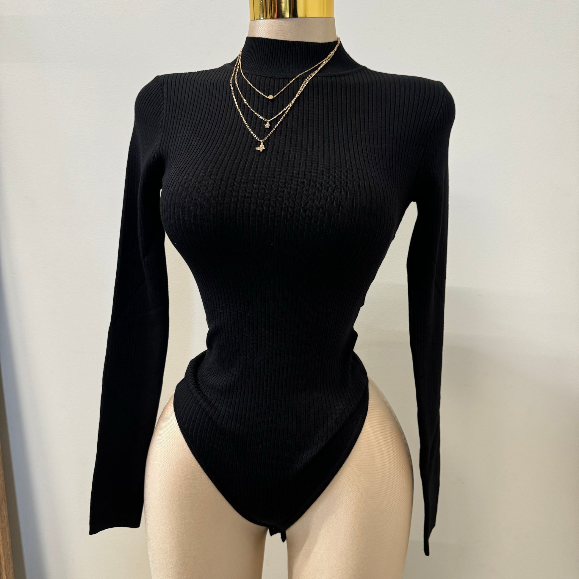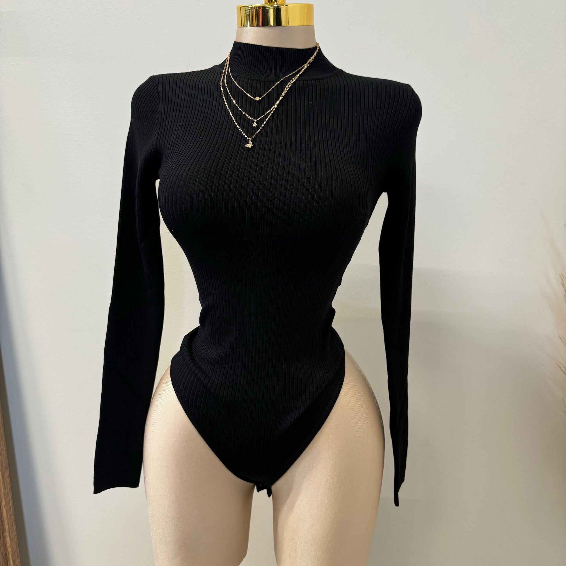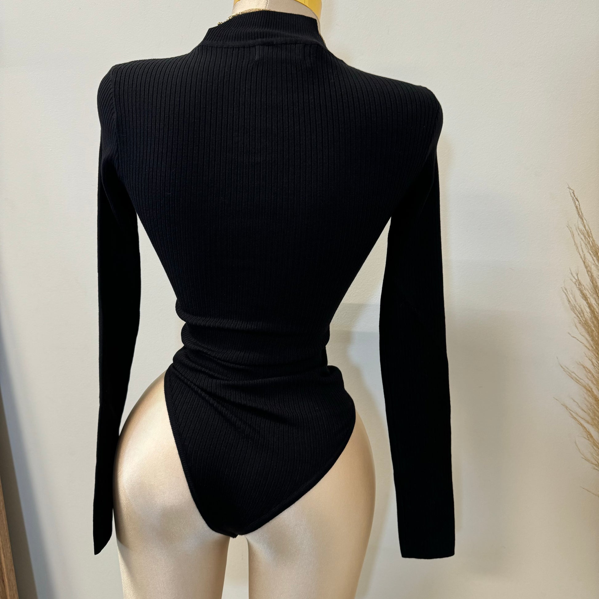High Neck Long Sleeve Ribbed Knit Bodysuit-Black