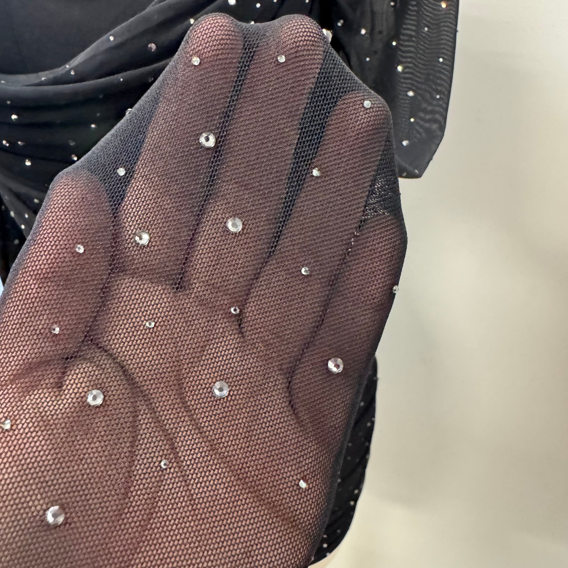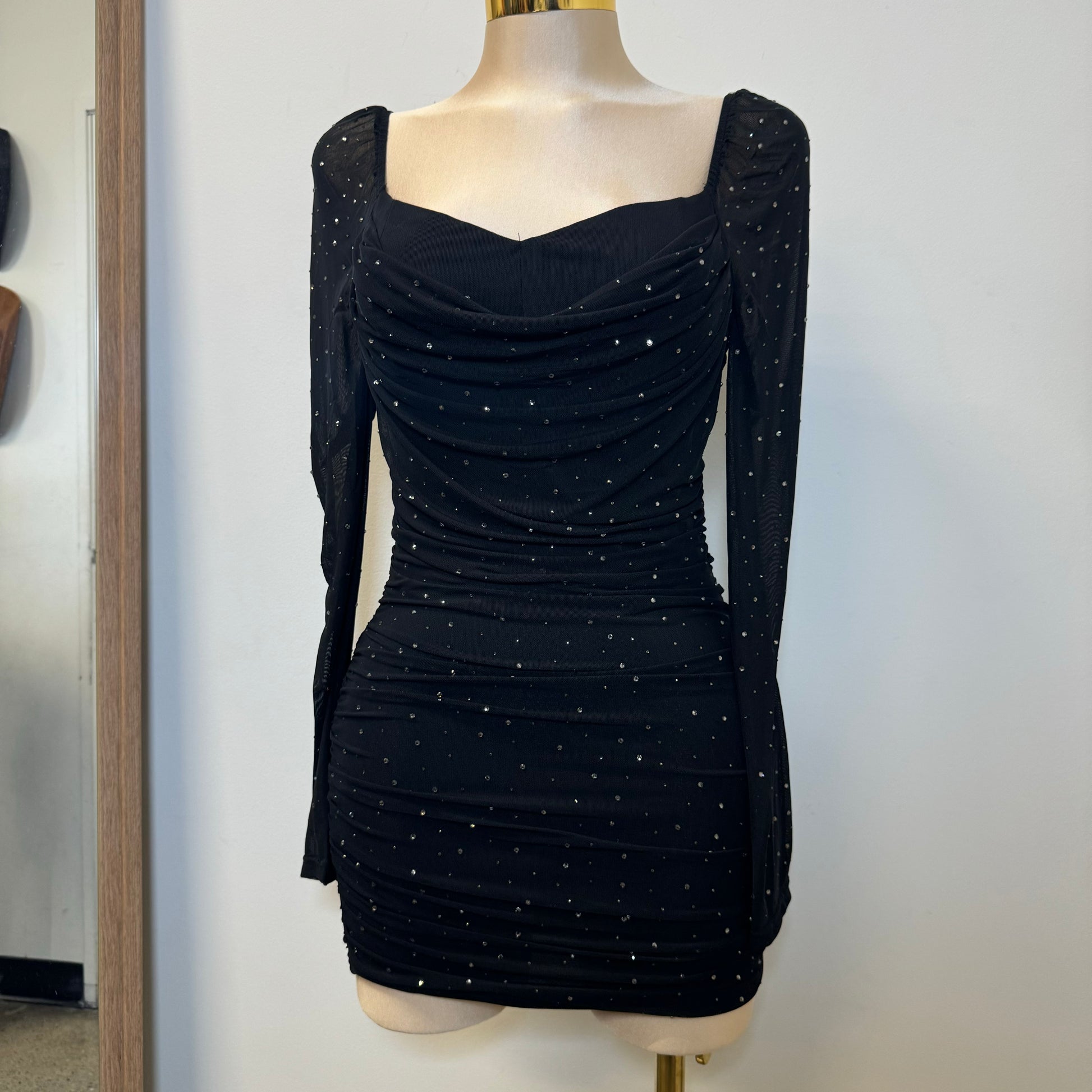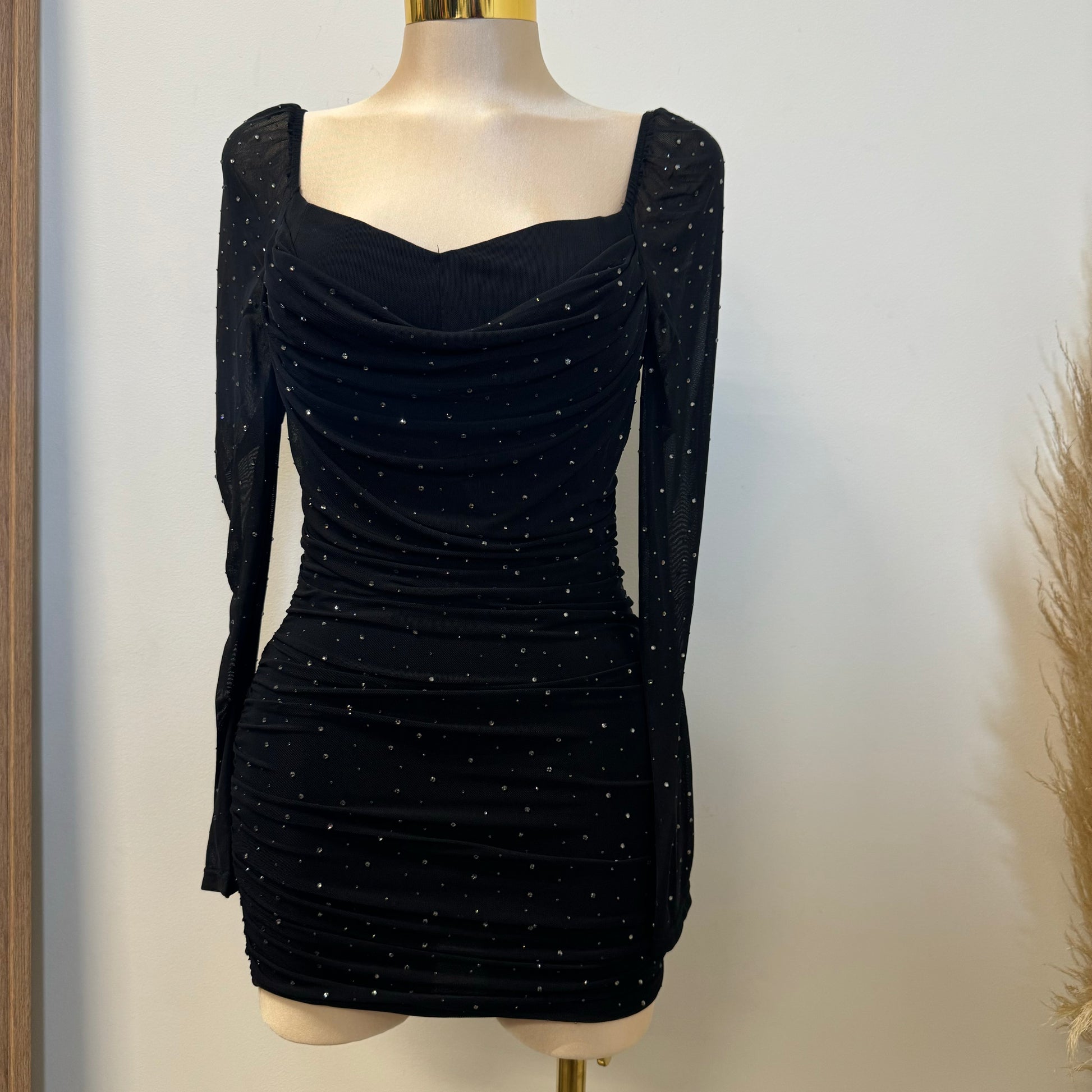 LUXE MESH HOTFIXS STONES EMBELLISHED COWL NECK LONG SLEEVES RUCHED MINI DRESS