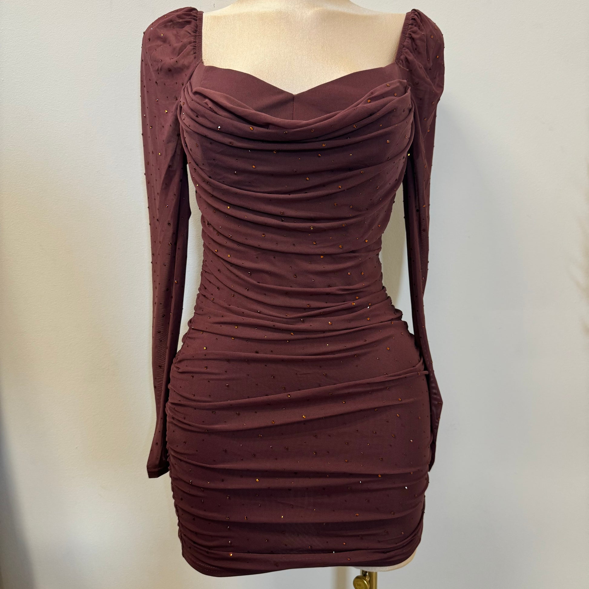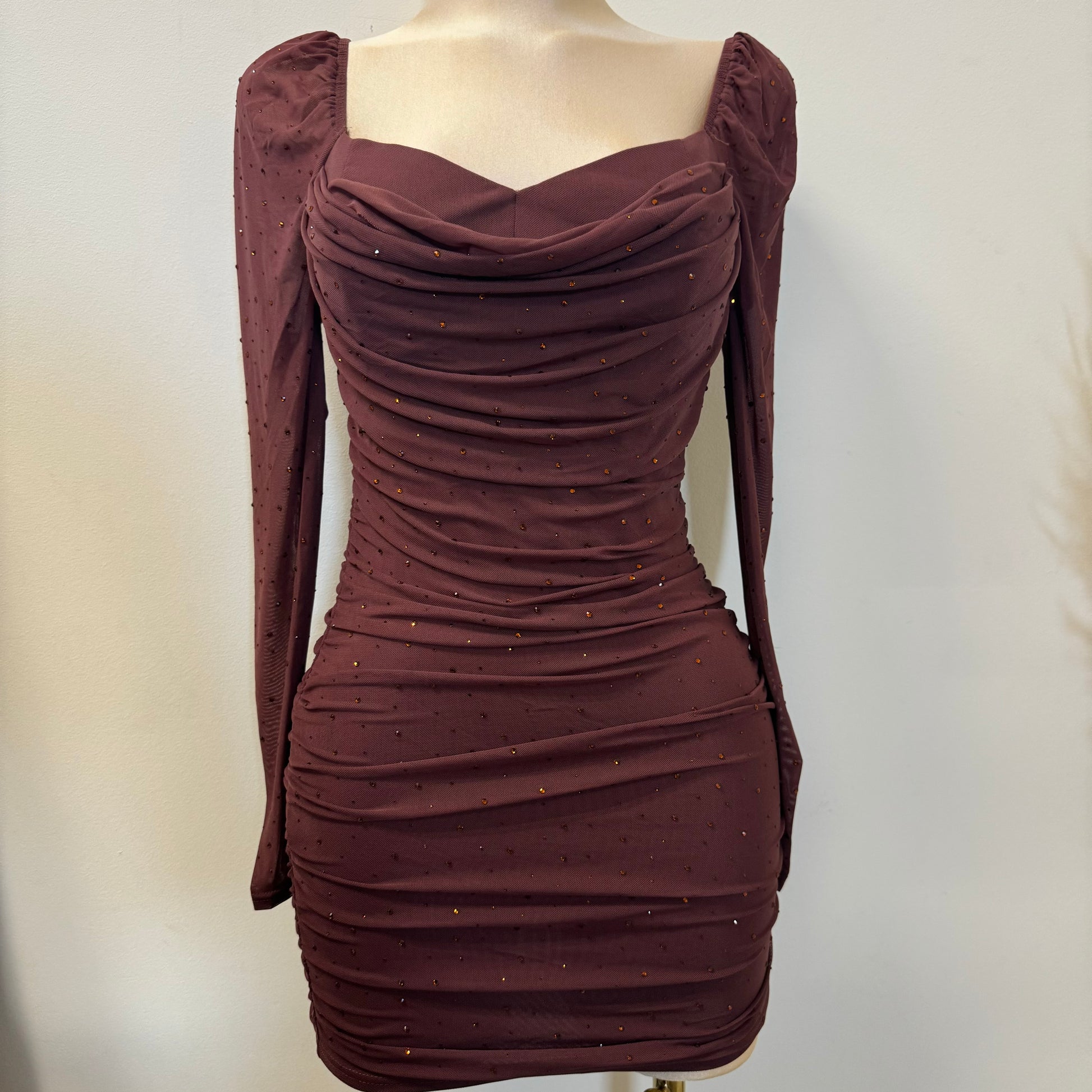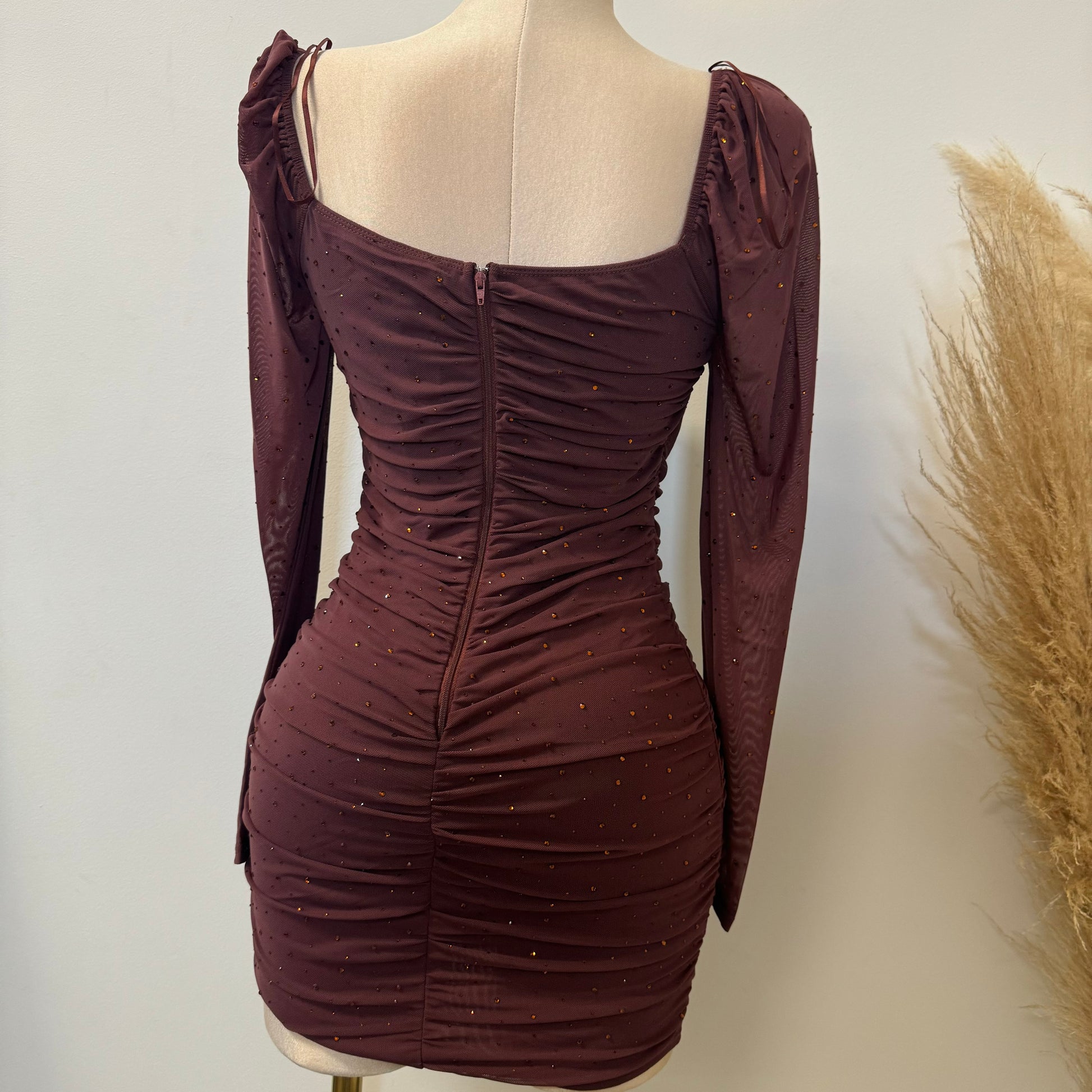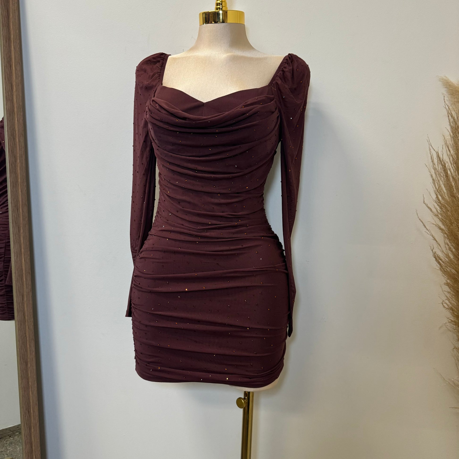 LUXE MESH HOTFIXS STONES EMBELLISHED COWL NECK LONG SLEEVES RUCHED MINI DRESS