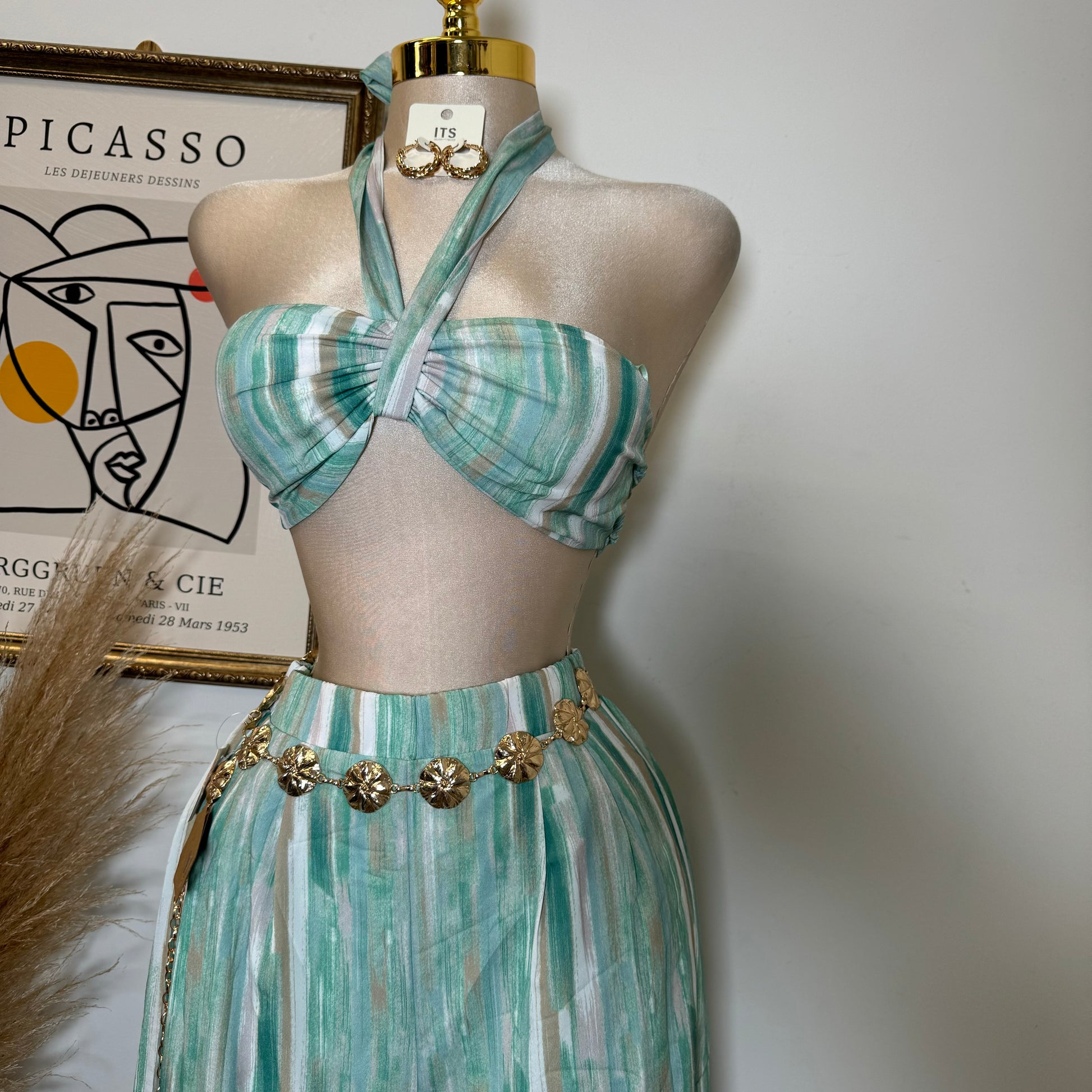 Woven Print Front Tie Crop Cami & Wide Pants-Green