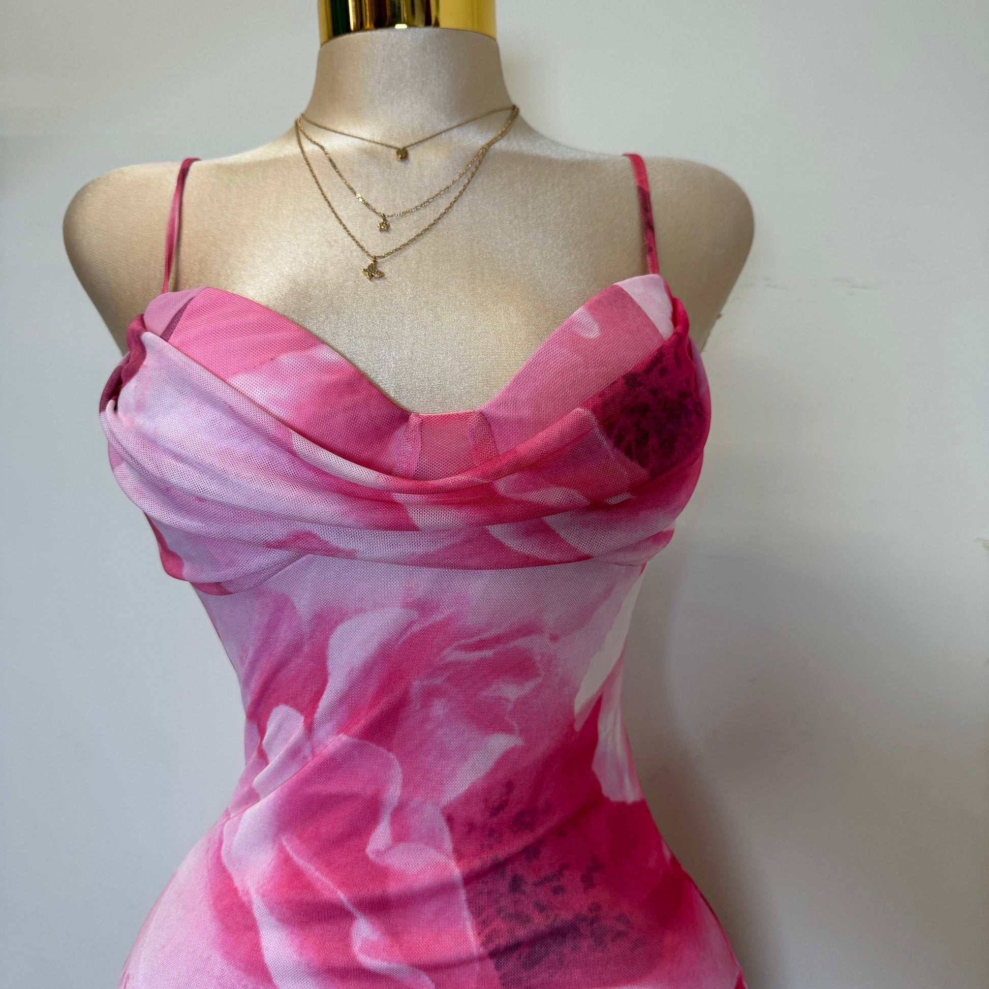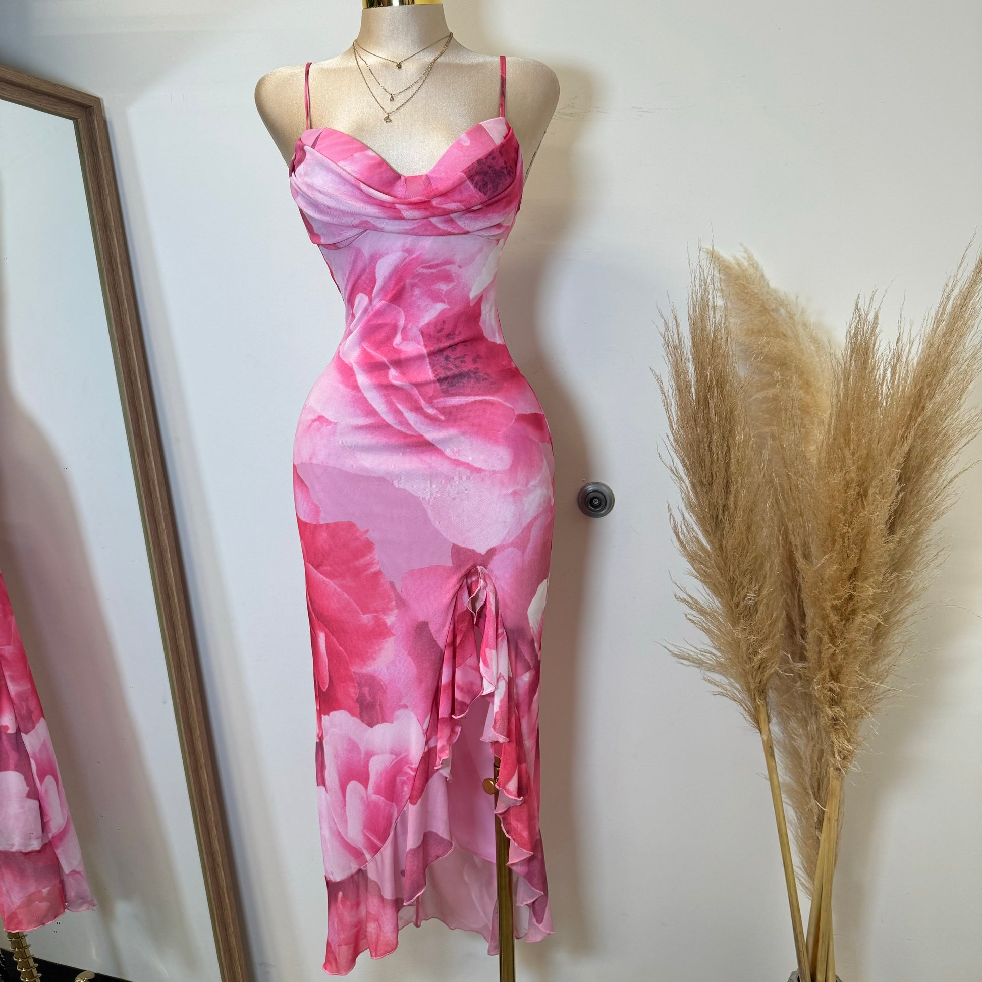 Zabrina Floral Ruffle Slit Mesh Dress-Pink